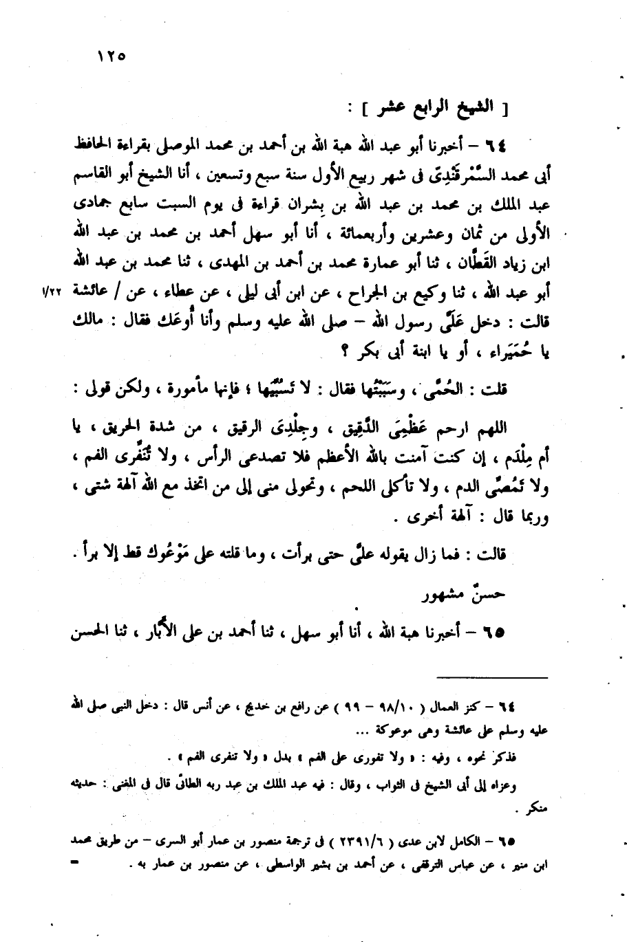 [64] أَخْبَرَنَا أَبُو عَبْدِ اللَّهِ هِبَةُ اللَّهُ بْنُ أَحْمَدَ بْنِ مُحَمَّدٍ الْمَوْصِلِيُّ بِقِرَاءَةِ الْحَافِظِ أَبِي مُحَمَّدٍ السَّمَرْقَنْدِيِّ فِي شَهْرِ رَبِيعٍ الأَوَّلِ سَنَةَ سَبْعٍ وَتِسْعِينَ، أنا الشَّيْخُ أَبُو الْقَاسِمِ عَبْدُ الْمَلِكِ بْنُ مُحَمَّدِ بْنِ عبد لله بْنِ بِشْرَانَ قِرَاءَةً فِي يَوْمِ السَّبْتِ سَابِعِ جُمَادَى الأُولَى مِنْ ثمان وعشرين وأربعمائة، أنا أَبُو سَهْلٍ أَحْمَدُ بْنُ مُحَمَّدِ بْنِ عَبْدِ اللَّهِ بْنِ زياد القطان، ثنا أبو عمارة محمد بن أحمد بن المهدي، ثنا محمد بن عبد الله أبو عبد الله، ثنا وَكِيعُ بْنُ الْجَرَّاحِ، عَنِ ابْنِ أَبِي لَيْلَى، عَنْ عَطَاءٍ، عَنْ عَائِشَةَ قَالَتْ: دَخَلَ عليَّ رَسُولُ اللَّهِ -صَلَّى اللَّهُ عَلَيْهِ وَسَلَّمَ- وَأَنَا أُوعَك فَقَالَ: "مَا لك يا حُميراء، أو يابنة أَبِي بَكْرٍ؟ ".