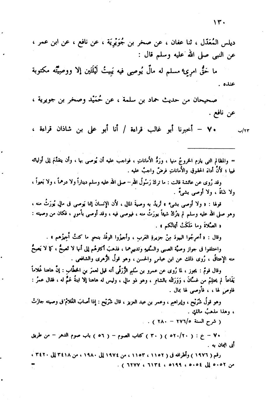 "مَا حَقُّ امْرِئٍ مُسْلِمٍ لَهُ مَالٌ يُوصي فِيهِ يَبِيتُ لَيْلَتَيْنِ إِلا ووصيته مكتوبة عنده".