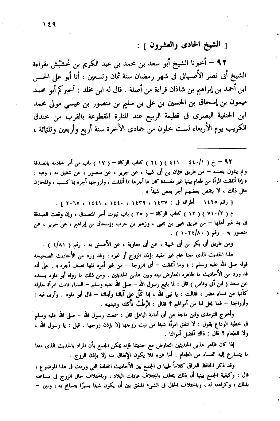 [92] خ "1/ 440، 441" "24" كتاب الزكاة - "17" باب من أمر خادمه بالصدقة ولم يناول بنفسه - من طريق عثمان بن أبي شيبة، عن جرير، عن منصور، عن شقيق به، وفيه: "إذا أنفقت المرأة من طعام بيتها غير مفسدة كان لها أجرها بما أنفقت، ولزوجها أجره بما كسب، وللخازن مثل ذلك، لا ينقص بعضهم أجر بعض شيئًا".