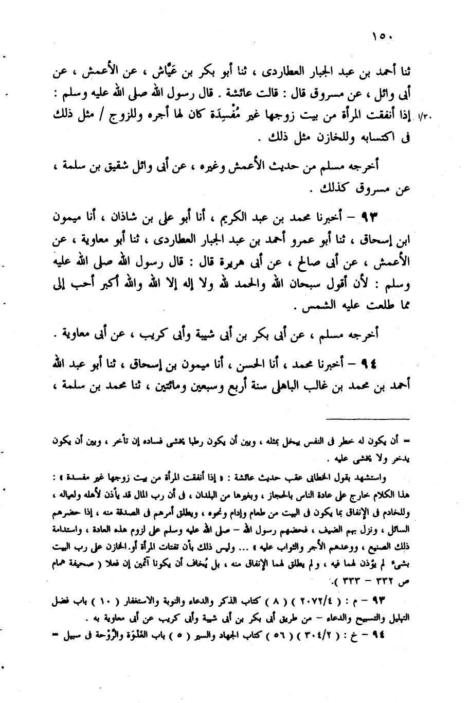 وأربعين وثلثمائة، ثنا أَحْمَدُ بْنُ عَبْدِ الْجَبَّارِ الْعُطَارِدِيُّ، ثنا أَبُو بَكْرِ بْنُ عَيَّاشٍ، عَنِ الأَعْمَشِ، عَنْ أَبِي وَائِلٍ، عَنْ مَسْرُوقٍ قَالَ: قَالَتْ عَائِشَةُ: قَالَ رَسُولُ اللَّهِ صَلَّى اللَّهُ عَلَيْهِ وَسَلَّمَ: "إِذَا أَنْفَقَتِ الْمَرْأَةُ مِنْ بَيْتِ زَوْجِهَا غَيْرَ مُفسدة كَانَ لَهَا أَجْرُهُ، وَللِزَّوْجِ مِثْلُ ذَلِكَ فِي اكْتِسَابِهِ، وَلِلْخَازِنِ مِثْلُ ذَلِكَ".
