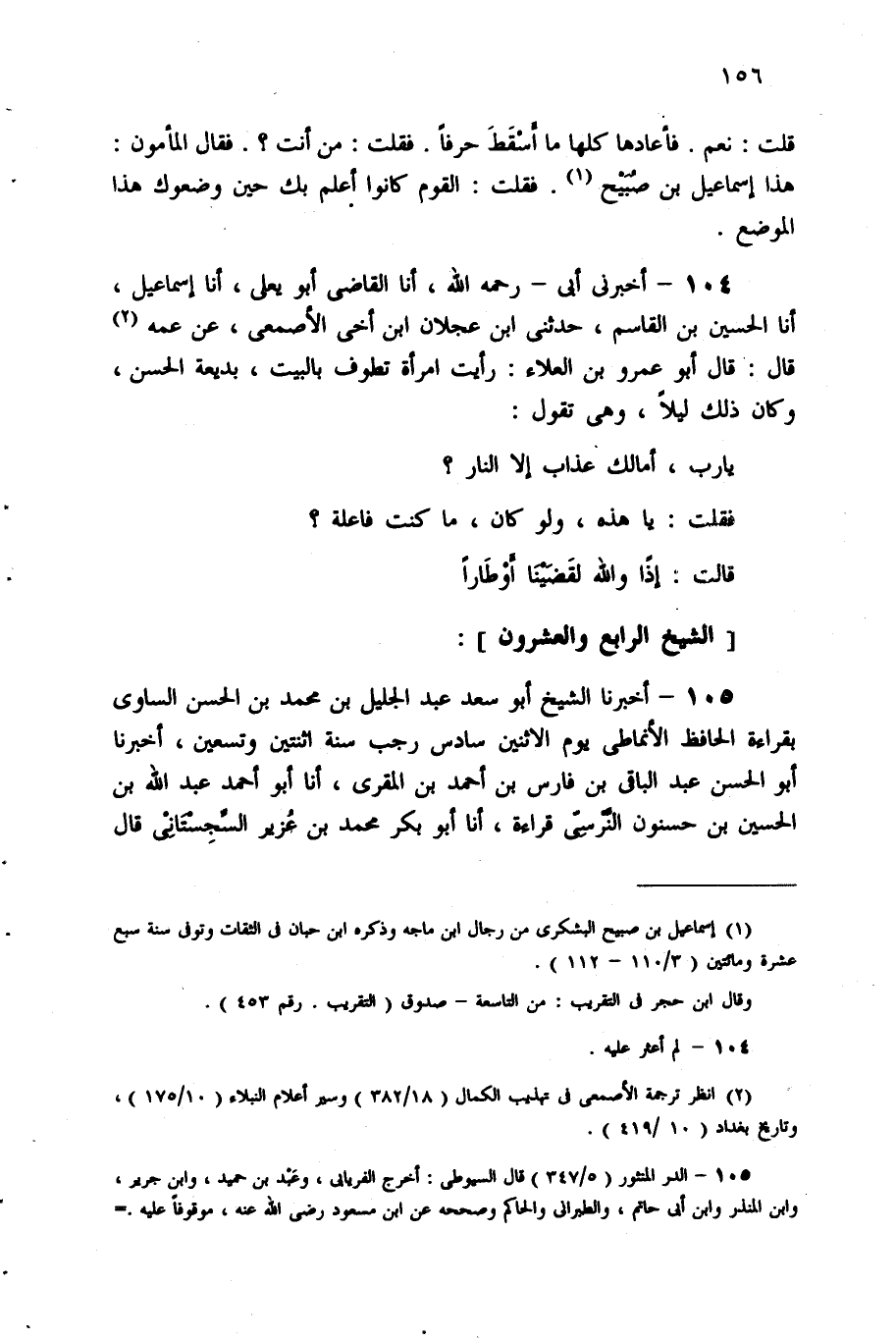 [104] أخبرني أبي -رحمه اللَّه- أنا القاضي أبو يعلي، أنا إسماعيل، أنا الحسين بْن القاسم، حدثني ابن عجلان ابن أخي الأصمعي، عن عمه2 قَالَ: قَالَ أبو عمرو بْن العلاء: رأيت امرأة تطوف بالبيت، بديعة الحسن، وكان ذلك ليلا، وهي تقول:
