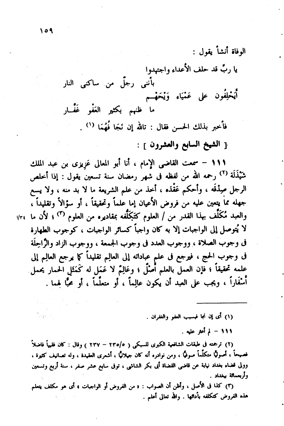 [111] سمعت القاضي الإمام، أنا أبو المعالي عَزِيزي بْن عبد الملك شَيْذَلَة2 -رحمه اللَّه- من لفظه في شهر رمضان سنة تسعين يقول: إذا أخلص الرجل صدقة، وأحكم عقده، أخذ من علم الشريعة ما لا بد منه، ولا يسع جهله مما يتعين عليه من فروض الأعيان إما علما وتحقيقا، أو سؤالا وتقليدا، والعبد مكلَّف بهذا القدر من العلوم كتكلفة بمقاديره من العلوم3؛ لأن ما لا يُتوصل إلى الواجبات إلا به كان واجبا كسائر الواجبات؛ كوجوب الطهارة في وجوب الصلاة، ووجوب العدد في وجوب الجمعة، ووجوب الزاد والراحلة في وجوب الحج، فيرجع في علم عباداته إلى العالِم تقليدا كما يرجع العالِم إلى علمه تحقيقا؛ فإن العمل بالعلم أصل، وعالم لا عمل له كمثل الحمار يحمل أسفارا، ويجب على العبد أن يكون عالما، أو متعلمًا، أو محبًّا لهما.