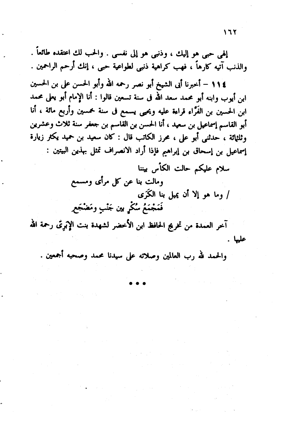 [114] أَخْبَرَنَا أبي الشيخ أبو نصر -رحمه اللَّه- وأَبُو الْحَسَنِ علي بْن الحسين بْن أيوب وابنه أبو مُحَمَّد سعد اللَّه في سنة تسعين قالوا: أنا الإمام أبو يعلى مُحَمَّد بْن الحسين بْن الفراء قراءة عليه ويحيى يسمع في سنة خمسين وأربعمائة، أنا أَبُو الْقَاسِمِ إِسْمَاعِيلُ بْنُ سعيد، أنا الحسن بْن القاسم بْن جَعْفَر سنة ثلاث وعشرين وثلاثمائة، حدثني أبو علي، محرز الكاتب قَالَ: كان سعيد بْن حميد يكثر زيارة إسماعيل بْن إسحاق بْن إبراهيم، فإذا أراد الانصراف تمثل بهذين البيتين:
