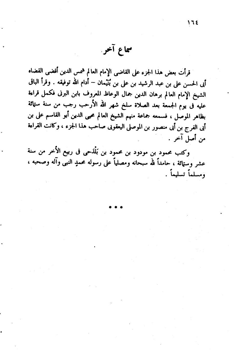 قرأت بعض هذا الجزء على القاضي الإمام العالم شمس الدين أقضى القضاة أبي الْحَسَنِ عَلِيُّ بْنُ عَبْدِ الرَّشِيدِ بن علي بن بنيمان -أدام الله توفيقه- وقرأ الباقي الشيخ الإمام العالم برهان الدين جمال الوعاظ المعروف بابن البرني فكمل قراءة عليه فِي يَوْمِ الْجُمُعَةِ بَعْدَ الصَّلاةِ سلخ شهر الله الأرحب رجب من سنة ستمائة بظاهر الموصل، فسمعه جماعة منهم الشيخ العالم محيي الدين أبو القاسم علي بن أبي الفرج بن أبي منصور بن الموصلي اليعقوبي صاحب هذا الجزء، وكانت القراءة من أصل آخر.