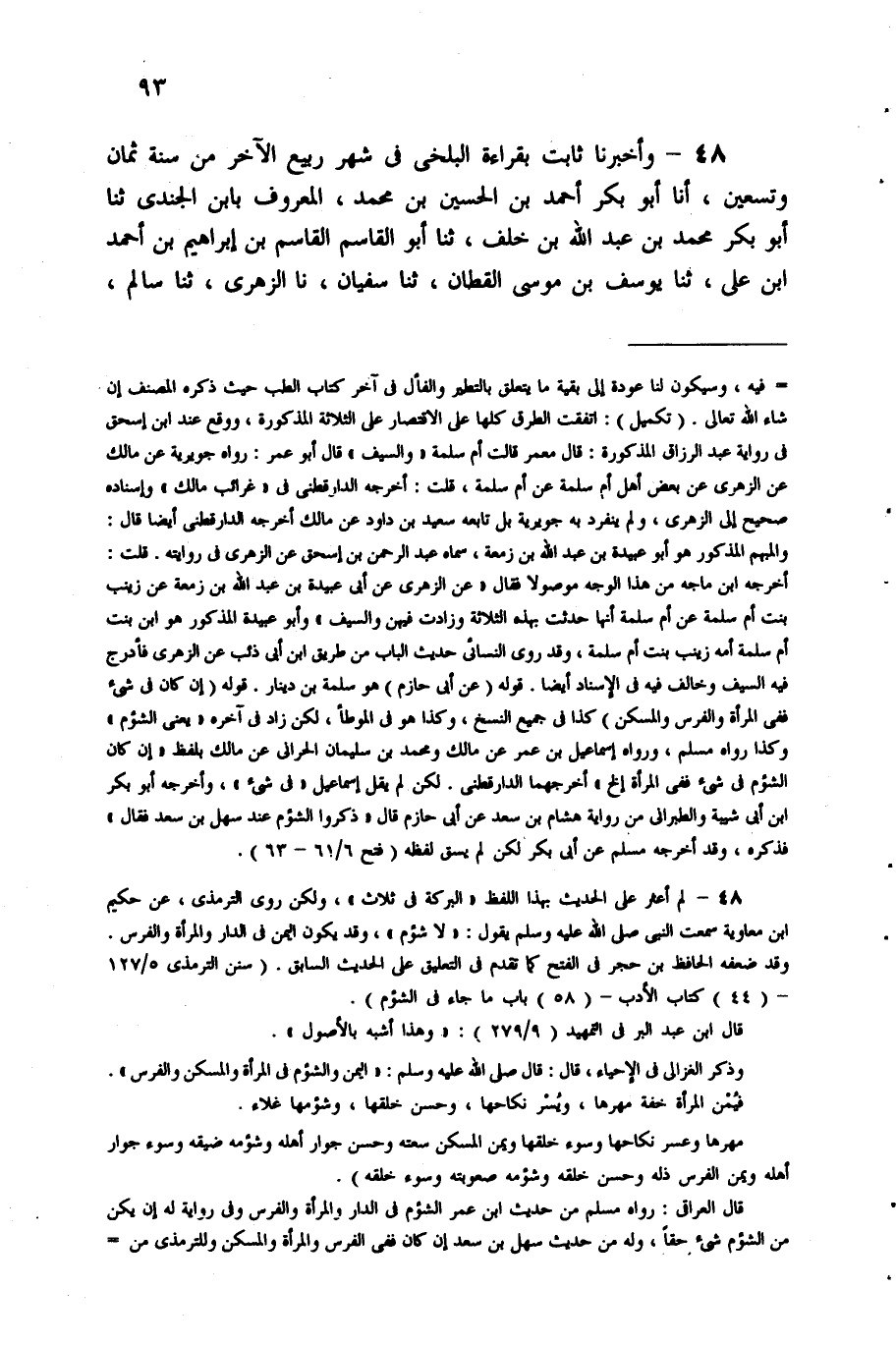 [48] لم أعثر على الحديث بهذا اللفظ: "البركة في ثلاث"؛ ولكن روى الترمذي، عن حكيم بن معاوية سمعت النبي -صلى الله عليه وسلم- يقول: "لا شؤم، وقد يكون اليمن في الدار والمرأة والفرس". وقد ضعفه الحافظ ابن حجر في الفتح كما تقدم في التعليق على الحديث السابق. "سنن الترمذي 5/ 127" - "44" كتاب الأدب - "58" باب ما جاء في الشؤم.