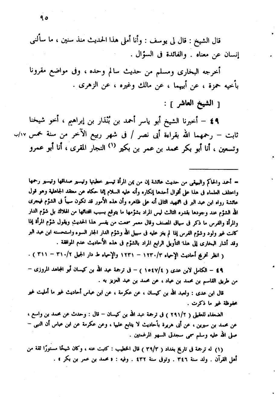 [49] أَخْبَرَنَا الشَّيْخُ أَبُو ياسر أحمد بُنْدَارِ بْنِ إِبْرَاهِيمَ، أَخُو شَيْخِنَا ثَابِتٍ -رَحِمَهُمَا اللَّهُ- بِقِرَاءَةِ أَبِي نَصْرٍ فِي شَهْرِ رَبِيعٍ الآخَرِ مِنْ سَنَةِ خَمْسٍ وَتِسْعِينَ، أنا أَبُو بَكْرٍ مُحَمَّدُ بْنُ عُمَرَ بن بكير1 النجار المقري، أنا أَبُو عَمْرٍو عُثْمَانُ بْنُ عمر