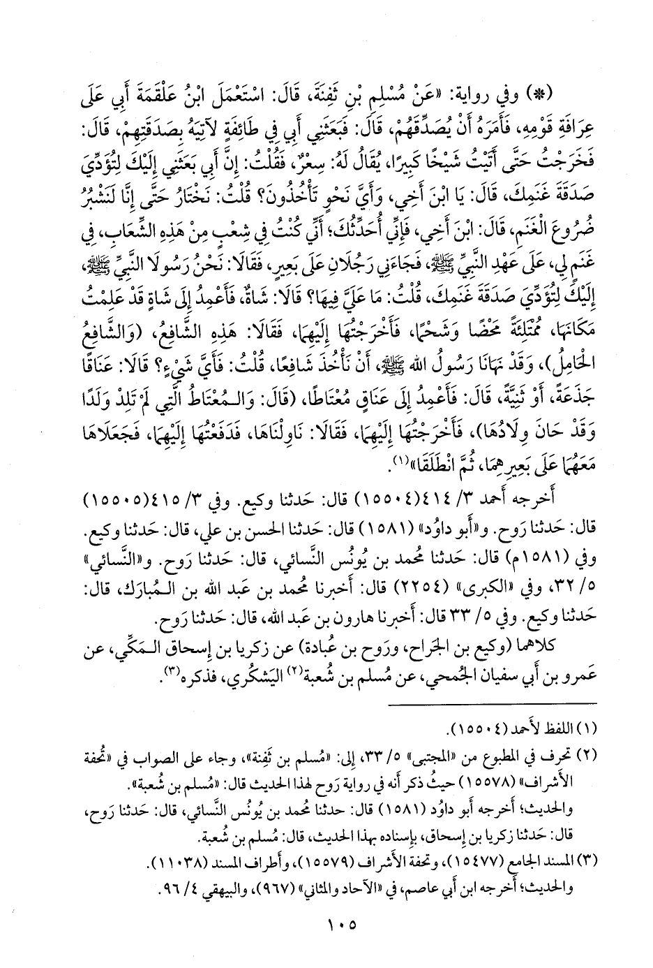 - وفي رواية: «عن مسلم بن ثفنة، قال: استعمل ابن علقمة أبي على عرافة قومه، فأمره أن يصدقهم، قال: فبعثني أبي في طائفة لآتيه بصدقتهم، قال: فخرجت حتى أتيت شيخا كبيرا، يقال له: سعر، فقلت: إن أبي بعثني إليك لتؤدي صدقة غنمك، قال: يا ابن أخي، وأي نحو تاخذون؟ قلت: نختار حتى إنا لنشبر ضروع الغنم، قال: ابن أخي، فإني أحدثك؛ أني كنت في شعب من هذه الشعاب، في غنم لي، على عهد النبي صَلى الله عَليه وسَلم فجاءني رجلان على بعير، فقالا: نحن رسولا النبي صَلى الله عَليه وسَلم إليك لتؤدي صدقة غنمك، قلت: ما علي فيها؟ قالا: شاة، فأعمد إلى شاة قد علمت مكانها، ممتلئة محضا وشحما، فأخرجتها إليهما، فقالا: هذه الشافع، (والشافع الحامل)، وقد نهانا رسول الله صَلى الله عَليه وسَلم أن ناخذ شافعا، قلت: فأي شيء؟ قالا: عَناقًا جذعة، أو ثنية، قال: فأعمد إلى عناق معتاطا، (قال: والمعتاط التي لم تلد ولدا وقد حان ولادها)، فأخرجتها إليهما، فقالا: ناولناها، فدفعتها إليهما، فجعلاها معهما على بعيرهما، ثم انطلقا» (¬١).
