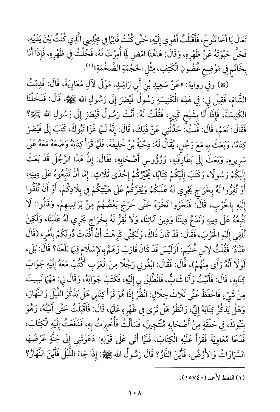 - وفي رواية: «عن سعيد بن أبي راشد مَولًى لآل معاوية، قال: قدمت الشام، فقيل لي: في هذه الكنيسة رسول قيصر إلى رسول الله صَلى الله عَليه وسَلم قال: فدخلنا الكنيسة، فإذا أنا بشيخ كبير، فقلت له: أنت رسول قيصر إلى رسول الله صَلى الله عَليه وسَلم؟ فقال: نعم، قال: قلت: حدثني عن ذلك، قال: إنه لما غزا تبوك، كتب إلى قيصر كتابا، وبعث به مع رجل، يقال له: دحية بن خليفة، فلما قرأ كتابه وضعه معه على سريره، وبعث إلى بطارقته، ورؤوس أصحابه، فقال: إن هذا الرجل قد بعث إليكم رسولا، وكتب إليكم كتابا، يخيركم إحدى ثلاث: إما أن تتبعوه على دينه، أو تقروا له بخراج يجري له عليكم ويقركم على هيئتكم في بلادكم، أو أن تلقوا إليه بالحرب، قال: فنخروا نخرة حتى خرج بعضهم من برانسهم، وقالوا: لا نتبعه على دينه وندع ديننا ودين آبائنا، ولا نقر له بخراج يجري له علينا، ولكن نلقي إليه الحرب، فقال: قد كان ذاك، ولكني كرهت أن أفتات دونكم بأمر، (قال عباد: فقلت لابن خثيم: أوليس قد كان قارب وهم بالإسلام فيما بلغنا؟ قال: بلى، لولا أنه رأى منهم)، قال: فقال: ابغوني رجلا من العرب أكتب معه إليه جواب كتابه، قال: فأتيت وأنا شاب، فانطلق بي إليه، فكتب جوابه، وقال لي: مهما نسيت من شيء فاحفظ عني ثلاث خلال: انظر إذا هو قرأ كتابي هل يذكر الليل والنهار، وهل يذكر كتابه إلي، وانظر هل ترى في ظهره علما، قال: فأقبلت حتى أتيته، وهو بتبوك، في حلقة من أصحابه منتجين، فسألت فأخبرت به، فدفعت إليه الكتاب، فدعا معاوية فقرأ عليه الكتاب، فلما أتى على قوله: دعوتني إلى جنة عرضها السماوات والأرض، فأين النار؟ قال رسول الله صَلى الله عَليه وسَلم: إذا جاء الليل فأين النهار؟