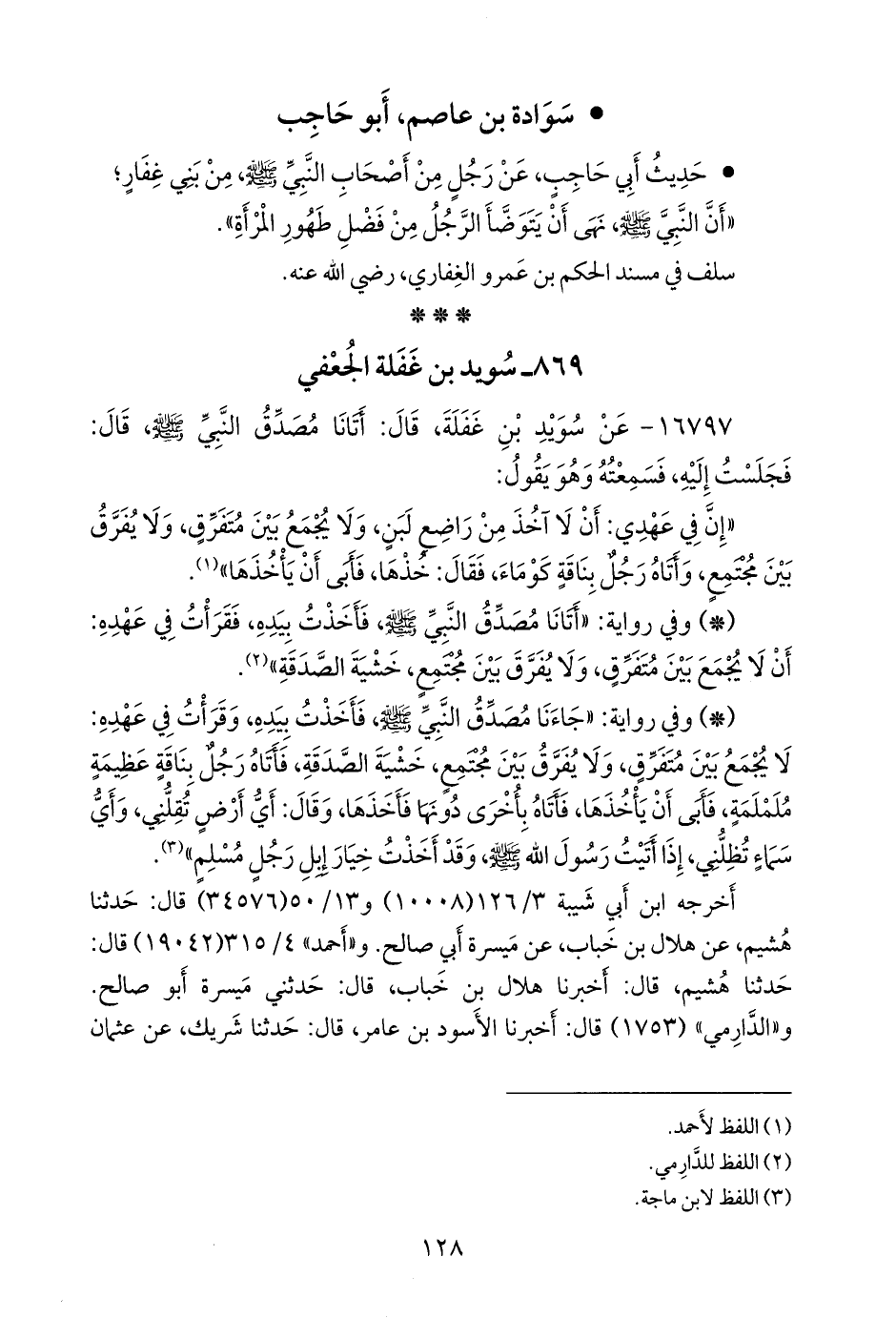 ١٦٧٩٧ - عن سويد بن غفلة، قال: أتانا مصدق النبي صَلى الله عَليه وسَلم قال: فجلست إليه، فسمعته وهو يقول: