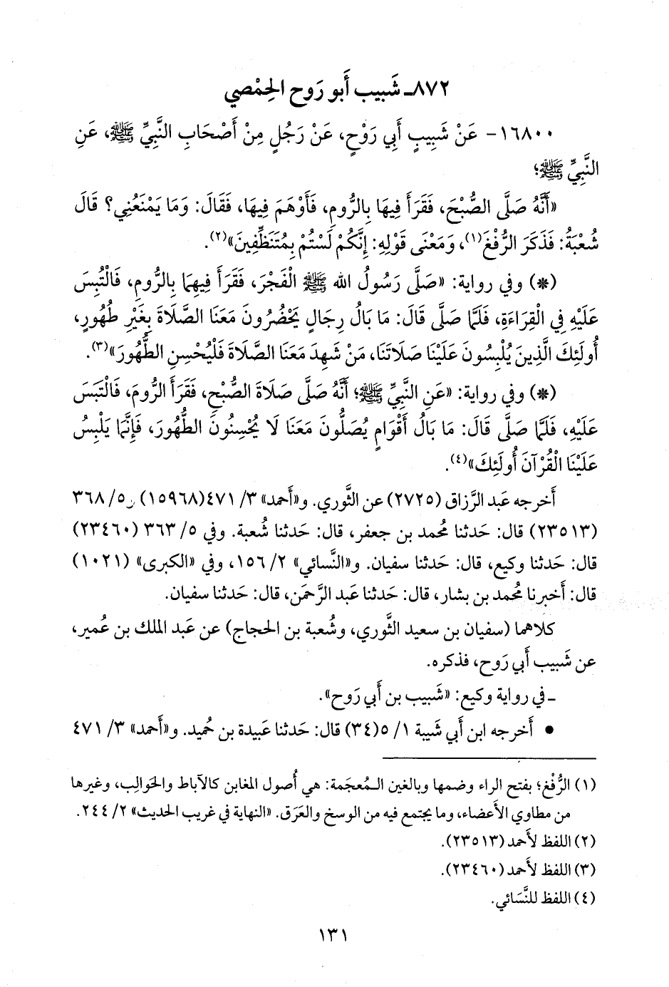 - وفي رواية: «عن شبيب أبي روح، من ذي الكلاع؛ أنه صلى مع النبي صَلى الله عَليه وسَلم الصبح، فقرأ بالروم، فتردد في آية، فلما انصرف قال: إنه يلبس علينا القرآن، أن أقواما منكم يصلون معنا لا يحسنون الوضوء، فمن شهد الصلاة معنا فليحسن الوضوء» (¬٢).