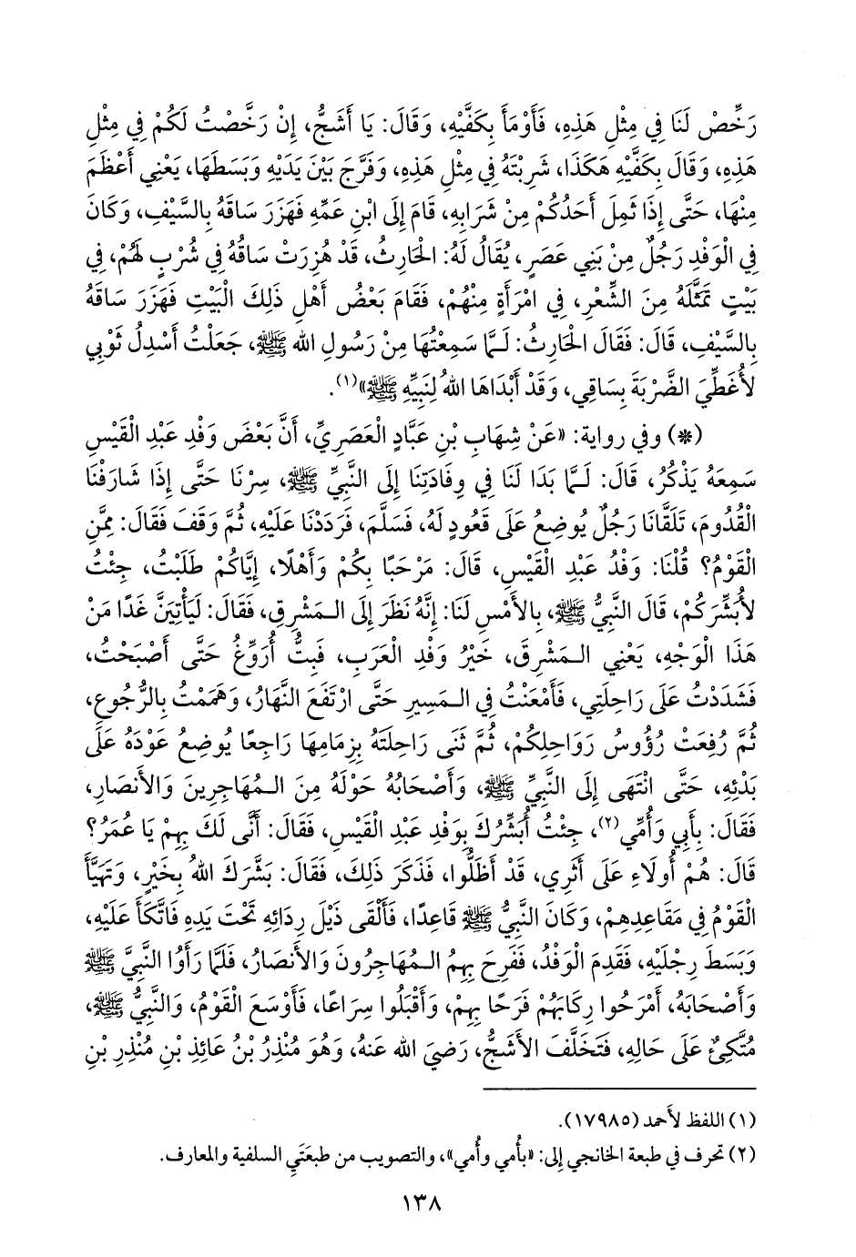 - وفي رواية: «عن شهاب بن عباد العصري، أن بعض وفد عبد القيس سمعه يذكر، قال: لما بدا لنا في وفادتنا إلى النبي صَلى الله عَليه وسَلم سرنا حتى إذا شارفنا القدوم، تلقانا رجل يوضع على قعود له، فسلم، فرددنا عليه، ثم وقف فقال: ممن القوم؟ قلنا: وفد عبد القيس، قال: مرحبا بكم وأهلا، إياكم طلبت، جئت لأبشركم، قال النبي صَلى الله عَليه وسَلم بالأمس لنا: إنه نظر إلى المشرق, فقال: ليأتين غدا من هذا الوجه، يعني المشرق، خير وفد العرب، فبت أروغ حتى أصبحت، فشددت على راحلتي، فأمعنت في المسير حتى ارتفع النهار، وهممت بالرجوع، ثم رفعت رؤوس رواحلكم، ثم ثنى راحلته بزمامها راجعا يوضع عوده على بدئه، حتى انتهى إلى النبي صَلى الله عَليه وسَلم وأصحابه حوله من المهاجرين والأنصار، فقال: بأبي وأمي (¬١)، جئت أبشرك بوفد عبد القيس، فقال: أنى لك بهم يا عمر؟ قال: هم أولاء على أثري، قد أظلوا، فذكر ذلك، فقال: بشرك الله بخير، وتهيأ القوم في مقاعدهم، وكان النبي صَلى الله عَليه وسَلم قاعدا، فألقى ذيل ردائه تحت يده فاتكأ عليه، وبسط رجليه، فقدم الوفد، ففرح بهم المهاجرون والأنصار، فلما رأوا النبي صَلى الله عَليه وسَلم وأصحابه، أمرحوا ركابهم فرحا بهم، وأقبلوا سراعا، فأوسع القوم، والنبي صَلى الله عَليه وسَلم متكئ على حاله، فتخلف الأشج، رضي الله عنه، وهو منذر بن عائذ بن منذر بن