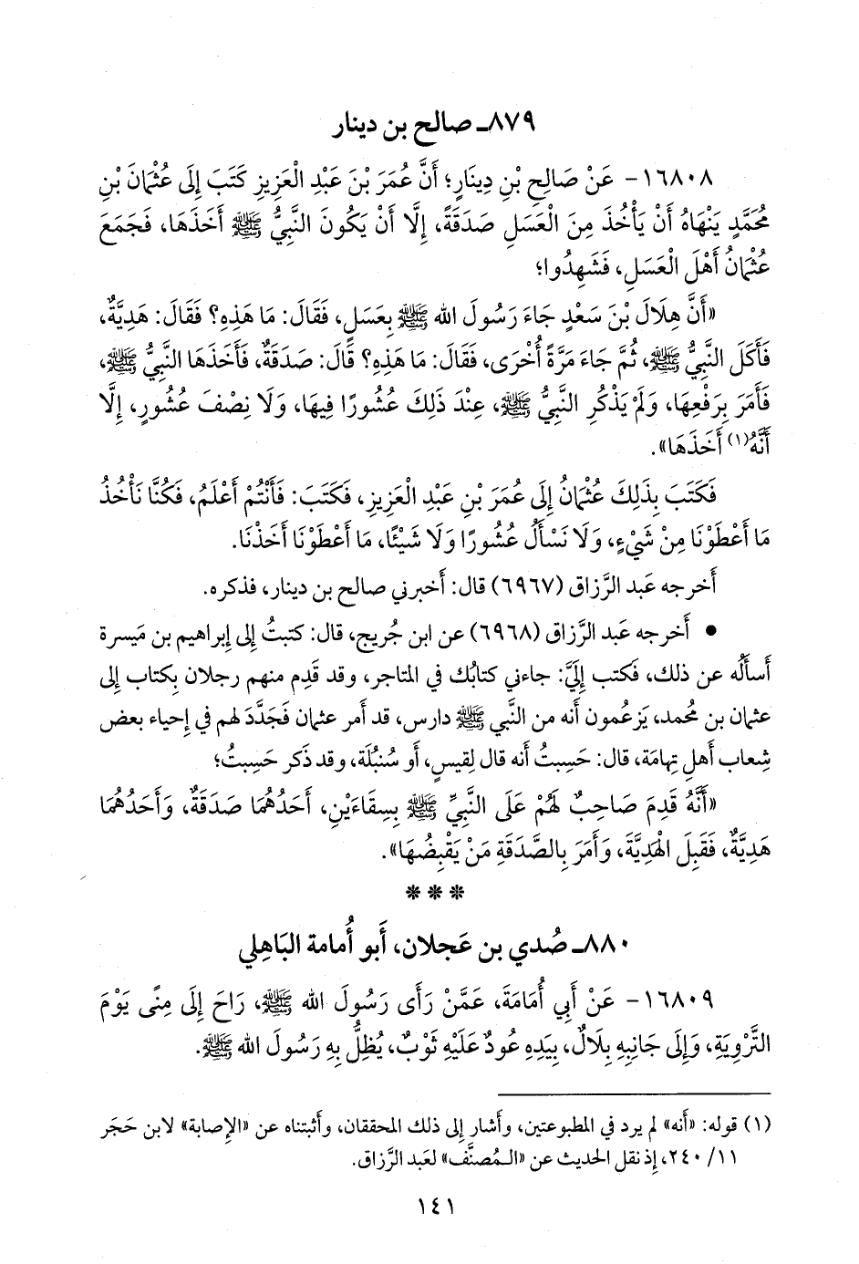 ١٦٨٠٨ - عن صالح بن دينار؛ أن عمر بن عبد العزيز كتب إلى عثمان بن محمد ينهاه أن ياخذ من العسل صدقة، إلا أن يكون النبي صَلى الله عَليه وسَلم أخذها، فجمع عثمان أهل العسل، فشهدوا؛