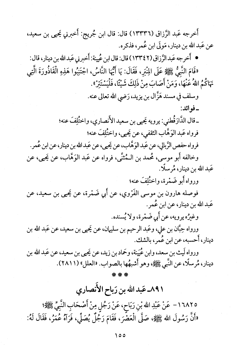 ورواه ليث بن سعد، وابن عُيينة، وحماد بن زيد، عن يحيى بن سعيد، عن عبد الله بن دينار، مرسلا، عن النبي صَلى الله عَليه وسَلم وهو أشبهها بالصواب. «العلل» (٢٨١١).
