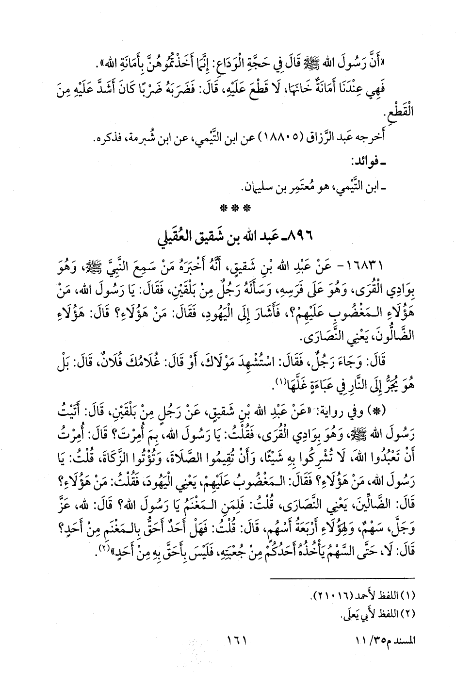 ١٦٨٣١ - عن عبد الله بن شقيق، أنه أخبره من سمع النبي صَلى الله عَليه وسَلم وهو بوادي القرى، وهو على فرسه، وسأله رجل من بلقين، فقال: يا رسول الله، من هؤلاء المغضوب عليهم؟، فأشار إلى اليهود، فقال: من هؤلاء؟ قال: هؤلاء الضالون، يعني النصارى.