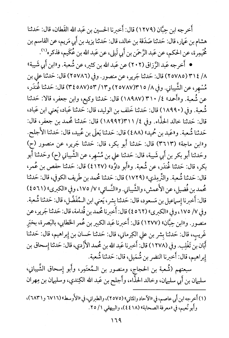 و «أَبو داود» (٤١٢٧) قال: حدثنا حفص بن عمر، قال: حدثنا شعبة. والتِّرمِذي» (١٧٢٩) قال: حدثنا محمد بن طريف الكوفي، قال: حدثنا محمد بن فضيل، عن الأعمش، والشيباني. و «النَّسَائي» ٧/ ١٧٥، وفي «الكبرى» (٤٥٦١) قال: أخبرنا إسماعيل بن مسعود، قال: حدثنا بشر، يعني ابن المُفَضَّل، قال: حدثنا شعبة. وفي ٧/ ١٧٥، وفي «الكبرى» (٤٥٦٢) قال: أخبرنا محمد بن قُدَامة، قال: حدثنا جرير، عن منصور. و «ابن حِبَّان» (١٢٧٧) قال: أخبرنا عبد الكبير بن عمر الخطابي، بالبصرة، بخبر غريب، قال: حدثنا بشر بن علي الكرماني، قال: حدثنا حسان بن إبراهيم، قال: حدثنا أبان بن تغلب. وفي (١٢٧٨) قال: أخبرنا عبد الله بن محمد الأزدي، قال: حدثنا إسحاق بن إبراهيم، قال: أخبرنا النضر بن شميل، قال: حدثنا شعبة.