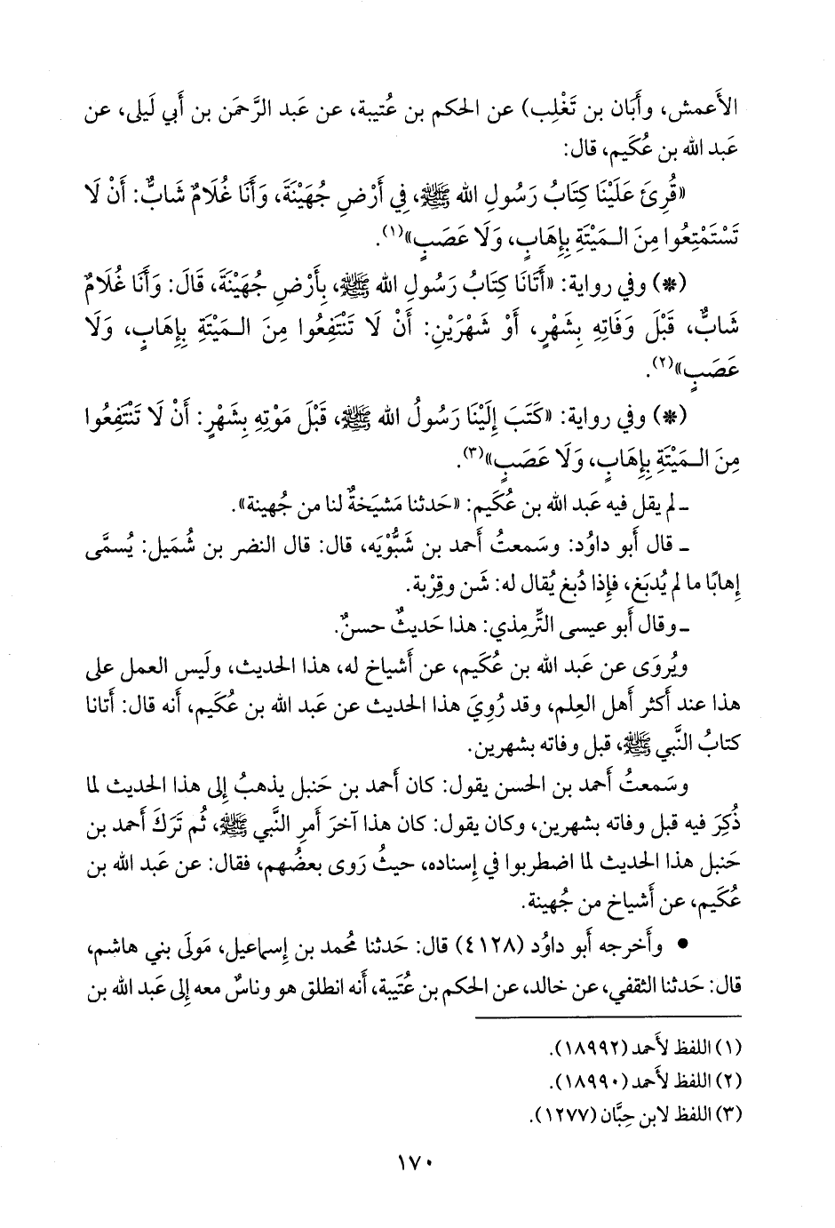وسمعت أحمد بن الحسن يقول: كان أحمد بن حنبل يذهب إلى هذا الحديث لما ذكر فيه قبل وفاته بشهرين، وكان يقول: كان هذا آخر أمر النبي صَلى الله عَليه وسَلم ثم ترك أحمد بن حنبل هذا الحديث لما اضطربوا في إسناده، حيث روى بعضهم، فقال: عن عبد الله بن عكيم، عن أشياخ من جهينة.