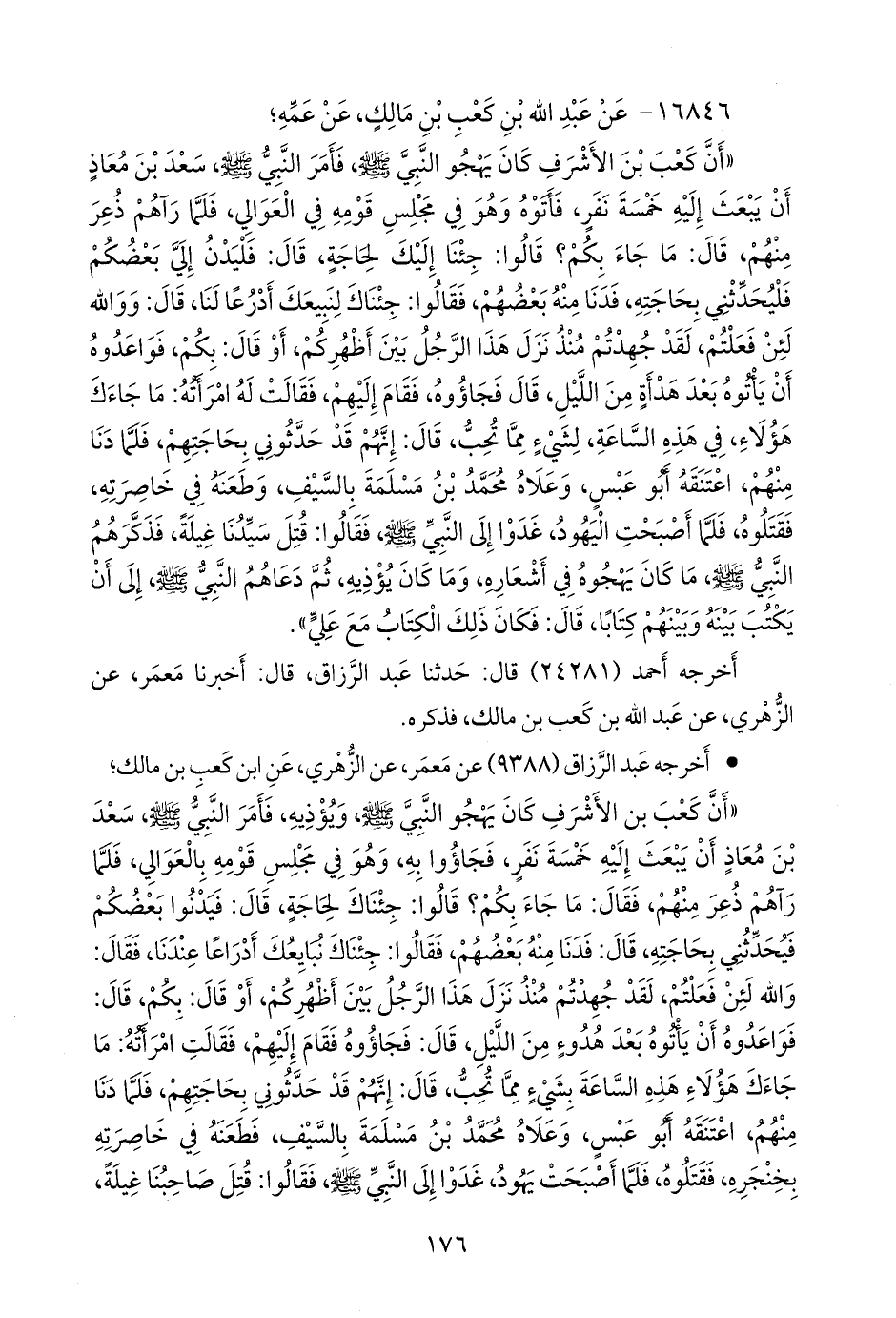 «أن كعب بن الأشرف كان يهجو النبي صَلى الله عَليه وسَلم فأمر النبي صَلى الله عَليه وسَلم سعد بن معاذ أن يبعث إليه خمسة نفر، فأتوه وهو في مجلس قومه في العوالي، فلما رأهم ذعر منهم، قال: ما جاء بكم؟ قالوا: جئنا إليك لحاجة، قال: فليدن إلي بعضكم فليحدثني بحاجته، فدنا منه بعضهم، فقالوا: جئناك لنبيعك أدرعا لنا، قال: ووالله لئن فعلتم، لقد جهدتم منذ نزل هذا الرجل بين أظهركم، أو قال: بكم، فواعدوه أن ياتوه بعد هدأة من الليل، قال فجاؤوه، فقام إليهم، فقالت له امرأته: ما جاءك هؤلاء، في هذه الساعة، لشيء مما تحب، قال: إنهم قد حدثوني بحاجتهم، فلما دنا منهم، اعتنقه أَبو عبس، وعلاه محمد بن مَسلَمة بالسيف، وطعنه في خاصرته، فقتلوه، فلما أصبحت اليهود، غدوا إلى النبي صَلى الله عَليه وسَلم فقالوا: قتل سيدنا غيلة، فذكرهم النبي صَلى الله عَليه وسَلم ما كان يهجوه في أشعاره، وما كان يؤذيه، ثم دعاهم النبي صَلى الله عَليه وسَلم إلى أن يكتب بينه وبينهم كتابا، قال: فكان ذلك الكتاب مع علي».