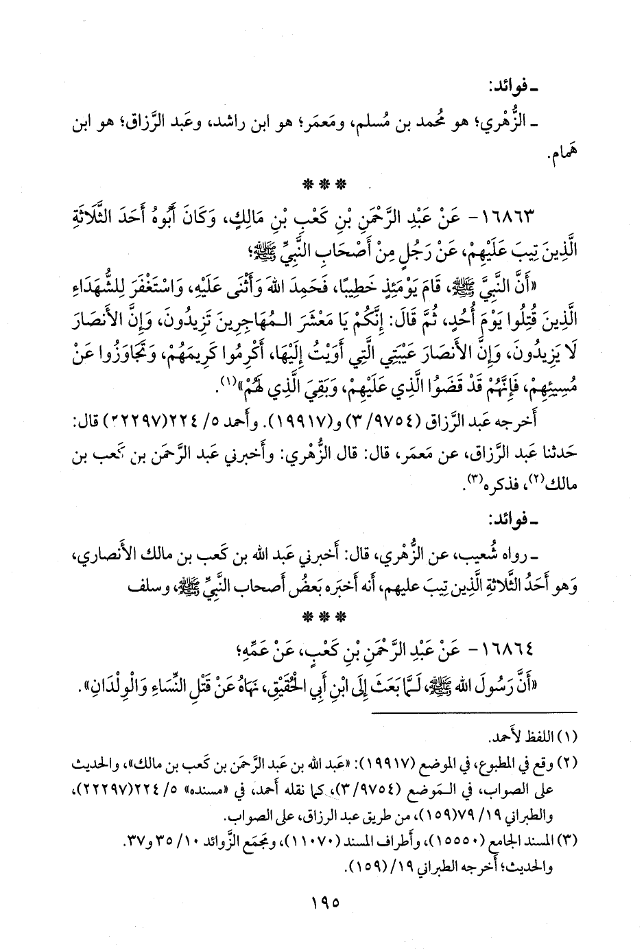 أخرجه عبد الرزاق (٩٧٥٤/ ٣) و (١٩٩١٧). وأحمد (٢٢٢٩٧) قال: حدثنا عبد الرزاق، عن مَعمَر, قال: قال الزُّهْري: وأخبرني عبد الرَّحمَن بن كعب بن مالك (¬٢)، فذكره (¬٣).