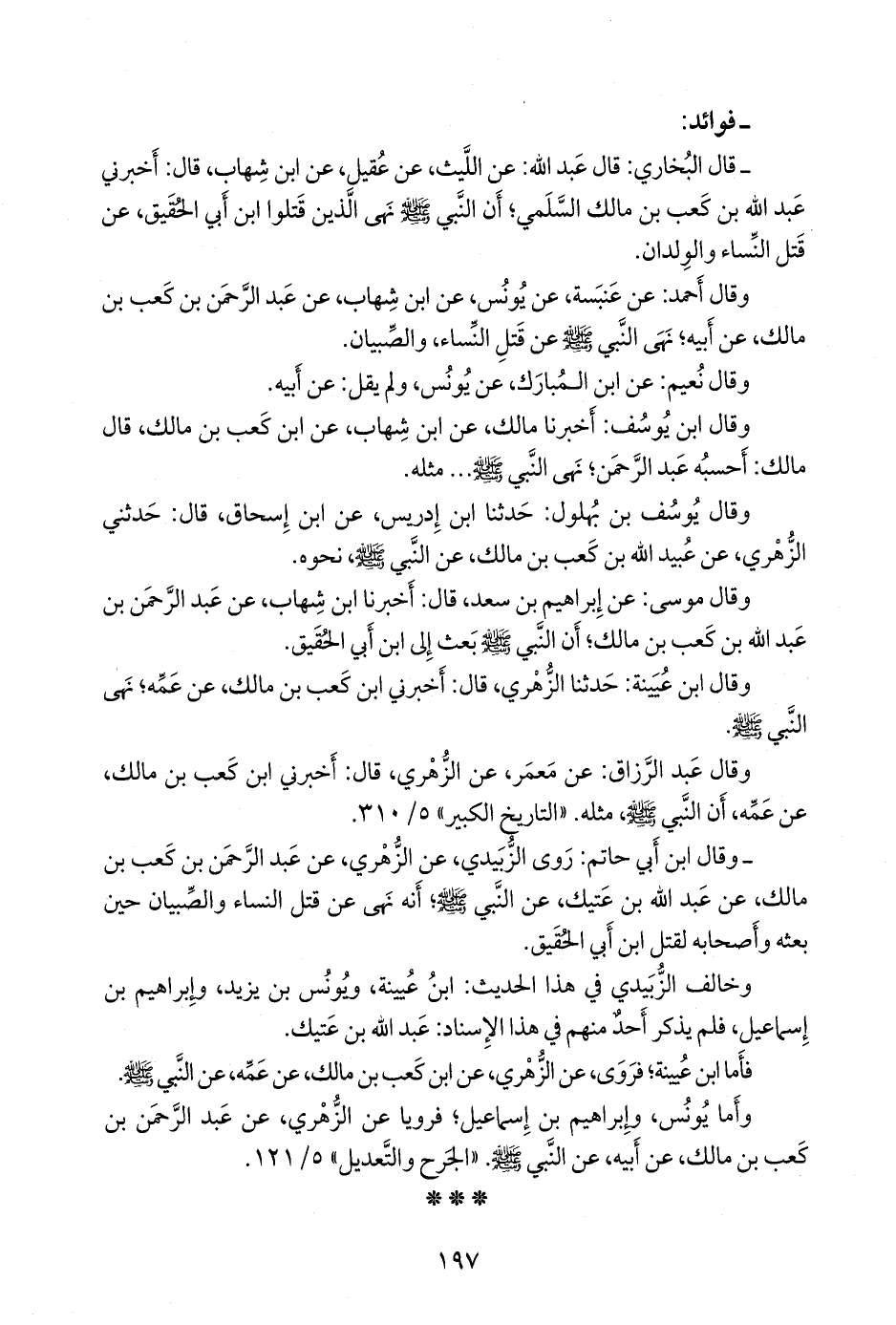 - قال البخاري: قال عبد الله: عن الليث، عن عُقيل، عن ابن شهاب، قال: أخبرني عبد الله بن كعب بن مالك السلمي؛ أن النبي صَلى الله عَليه وسَلم نهى الذين قتلوا ابن أبي الحقيق، عن قتل النساء والولدان.
