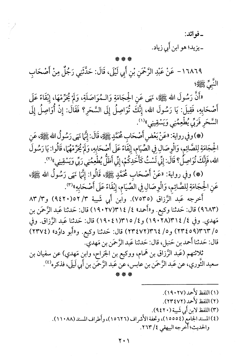- وفي رواية: «عن أصحاب محمد صَلى الله عَليه وسَلم قالوا: إنما نهى رسول الله صَلى الله عَليه وسَلم عن الحجامة للصائم، والوصال في الصيام، إبقاء على أصحابه» (¬٣).