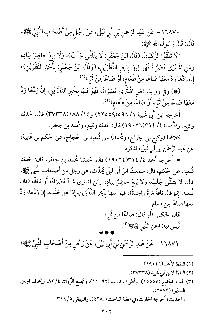 • أَخرجه أحمد (١٩٠٢٤) قال: حدثنا محمد بن جعفر، قال: حدثنا شعبة، عن الحكم، قال: سمعت ابن أبي ليلى يحدث، عن رجل من أصحاب النبي صَلى الله عَليه وسَلم قال: لا يتلقى جلب، ولا يبع حاضر لباد، ومن اشترى شاة مصراة، أو ناقة، (قال شعبة: إنما قال ناقة مرة واحدة)، فهو منها بآخر النظرين، إذا هو حلب، إن ردها، رد معها صاعا من طعام.