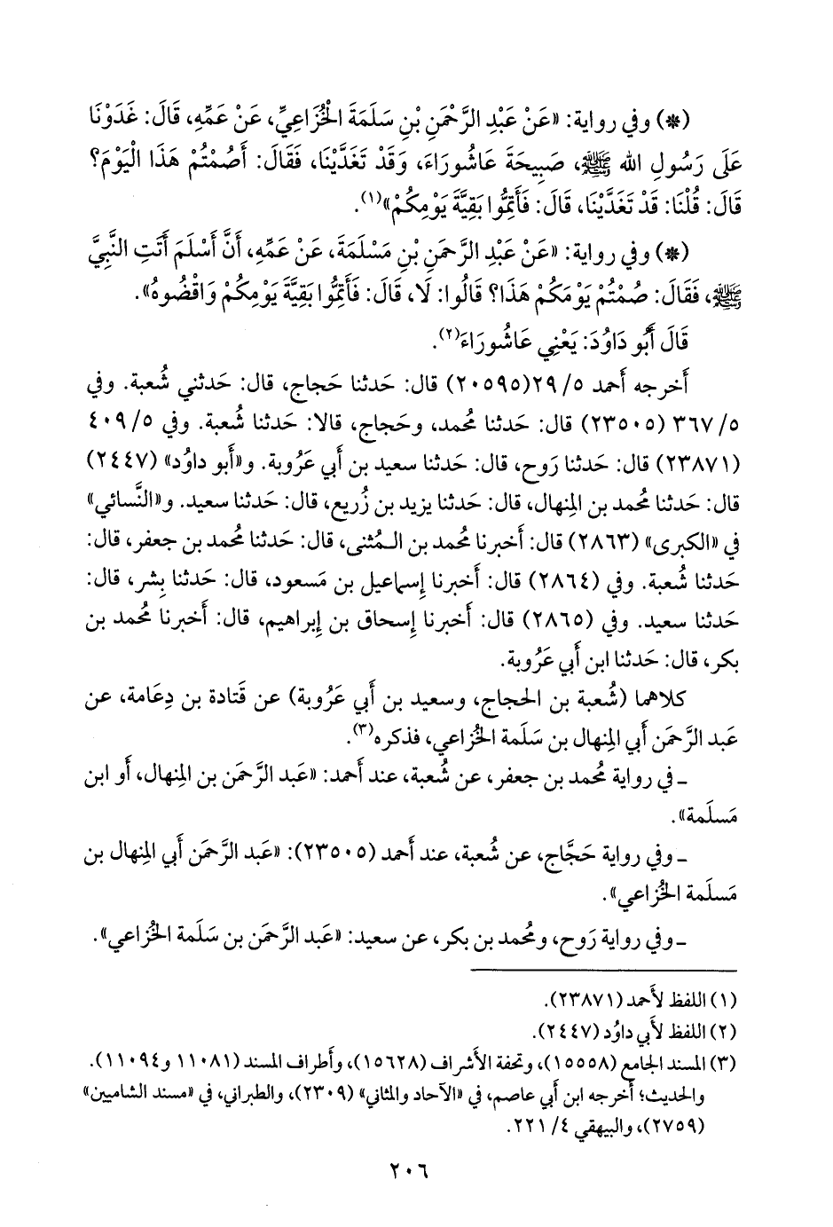 - وفي رواية روح، ومحمد بن بكر، عن سعيد: «عبد الرَّحمَن بن سلمة الخُزاعي».