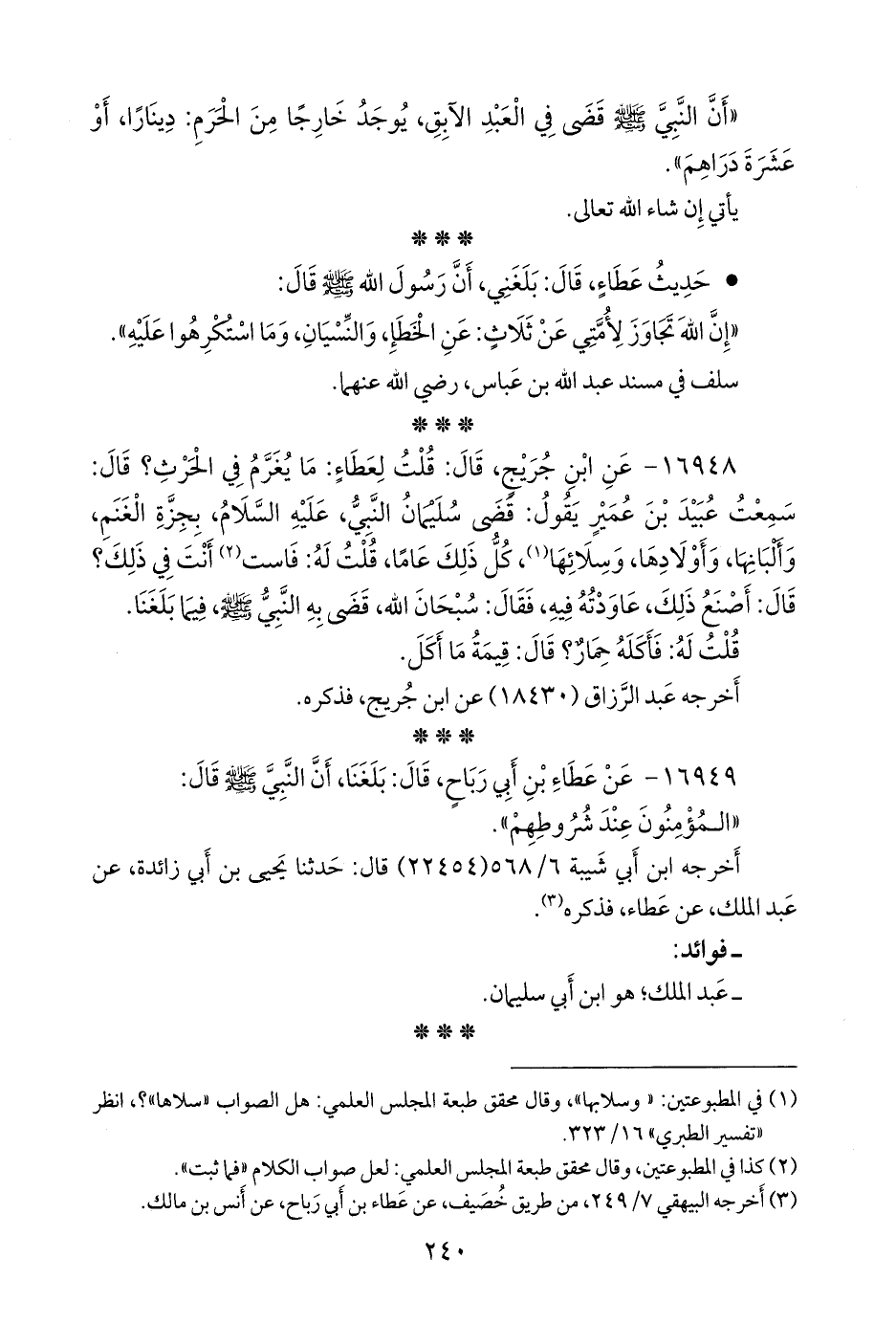 ١٦٩٤٨ - عن ابن جُريج، قال: قلت لعطاء: ما يغرم في الحرث؟ قال: سمعت عُبيد بن عُمير يقول: قضى سليمان النبي، عليه السلام، بجزة الغنم، وألبانها، وأولادها، وسلاها، كل ذلك عاما، قلت له: فأين أنت في ذلك؟ قال: أصنع ذلك، عاودته فيه، فقال: سبحان الله، قضى به النبي صَلى الله عَليه وسَلم فيما بلغنا.