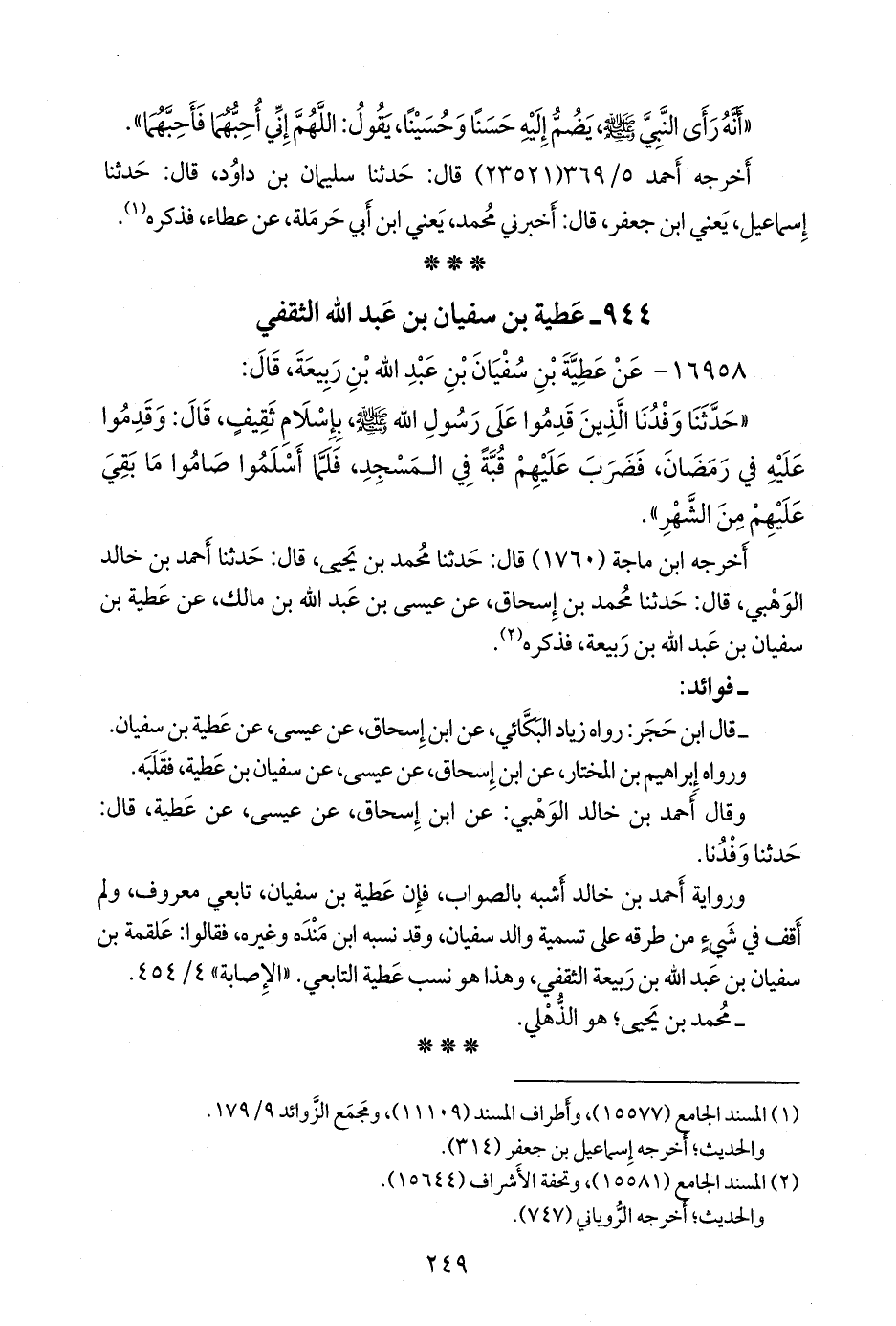 ورواية أحمد بن خالد أشبه بالصواب، فإن عطية بن سفيان، تابعي معروف، ولم أقف في شيء من طرقه على تسمية والد سفيان، وقد نسبه ابن منده وغيره، فقالوا: علقمة بن سفيان بن عبد الله بن ربيعة الثقفي، وهذا هو نسب عطية التابعي. «الإصابة» ٤/ ٤٥٤.