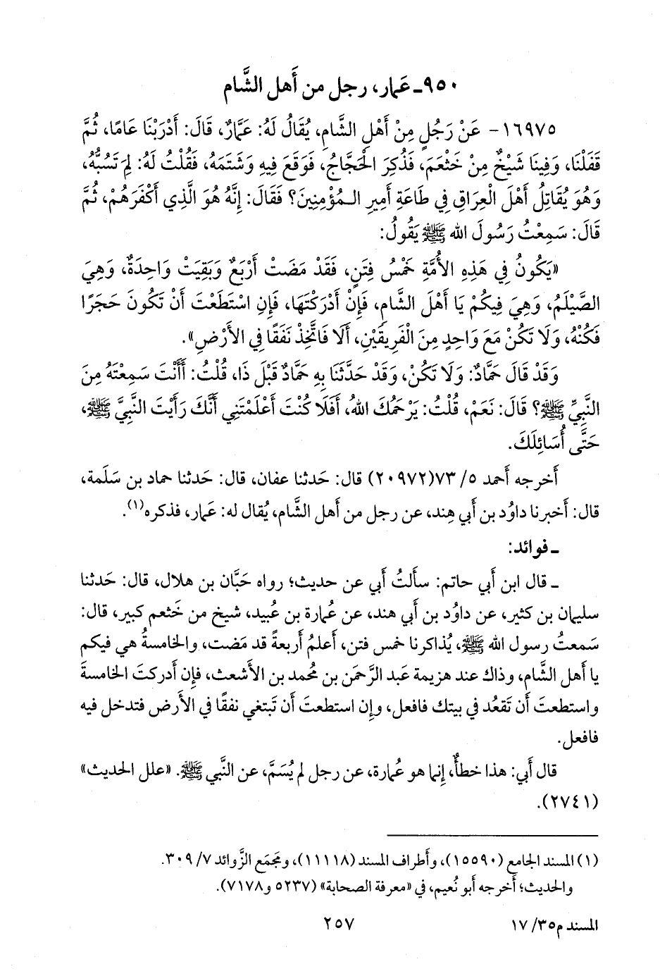 أخرجه أحمد (٢٠٩٧٢) قال: حدثنا عفان, قال: حدثنا حماد بن سلمة, قال: أخبرنا داود بن أبي هند، عن رجل من أهل الشام، يقال له: عمار، فذكره (¬١).