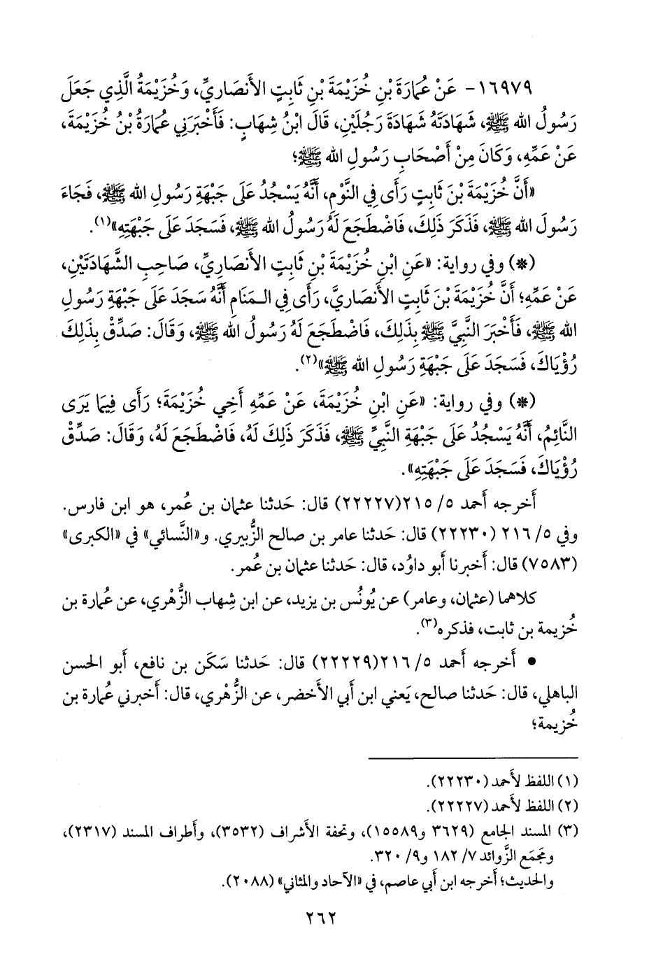 - وفي رواية: «عن ابن خزيمة بن ثابت الأَنصاري، صاحب الشهادتين، عن عمه؛ أن خزيمة بن ثابت الأَنصاري، رأى في المنام أنه سجد على جبهة رسول الله صَلى الله عَليه وسَلم فأخبر النبي صَلى الله عَليه وسَلم بذلك، فاضطجع له رسول الله صَلى الله عَليه وسَلم وقال: صدق بذلك رؤياك، فسجد على جبهة رسول الله صَلى الله عَليه وسَلم» (¬٢).