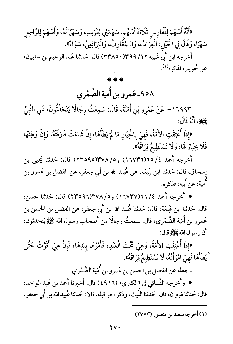 (¬١) وهكذا ورد في «تحفة الأشراف» (١٥٥٥٠)، في ترجمة الحسن بن عَمرو بن أُمية الضمري، عن رجال من أصحاب رسول الله صَلى الله عَليه وسَلم وأعاده المِزِّي في «تحفة الأشراف» (١٥٦٥١)، في ترجمة عَمرو بن أُمية الضمري، عن رجال من أصحاب النبي صَلى الله عَليه وسَلم ولكن فيه: عن أحمد بن عبد الواحد، عن مروان بن محمد، عن الليث، وذكر آخر قبله، كلاهما عن عُبيد الله بن أبي جعفر، عن الشعبي، عن عَمرو بن أُمية الضمري، أن رجالا من أصحاب النبي صَلى الله عَليه وسَلم حدثوه به، قال النَّسَائي: هذا عندي حديث منكر، والله أعلم، ولم يرد طريق الشعبي هذا في المطبوع من سنن النَّسَائي، المجتبى، أو الكبرى.