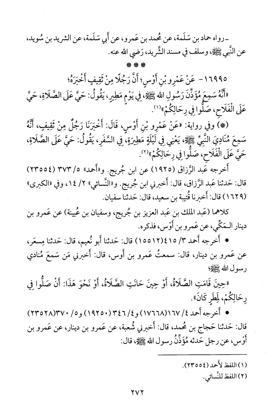 - وفي رواية: «عن عَمرو بن أوس، قال: أخبرنا رجل من ثقيف، أنه سمع منادي النبي صَلى الله عَليه وسَلم يعني في ليلة مطيرة، في السفر، يقول: حي على الصلاة، حي على الفلاح، صلوا في رحالكم» (¬٢).