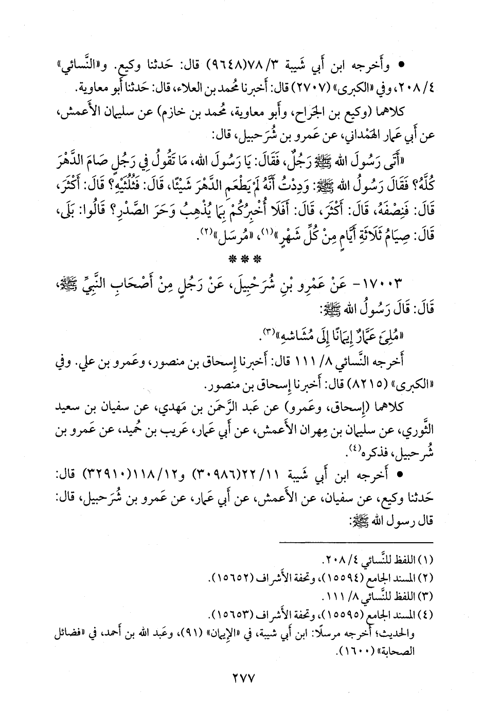 كلاهما (إسحاق، وعَمرو) عن عبد الرَّحمَن بن مهدي، عن سفيان بن سعيد الثوري، عن سليمان بن مِهران الأعمش، عن أبي عمار، عريب بن حميد، عن عَمرو بن شرحبيل، فذكره (¬٢).