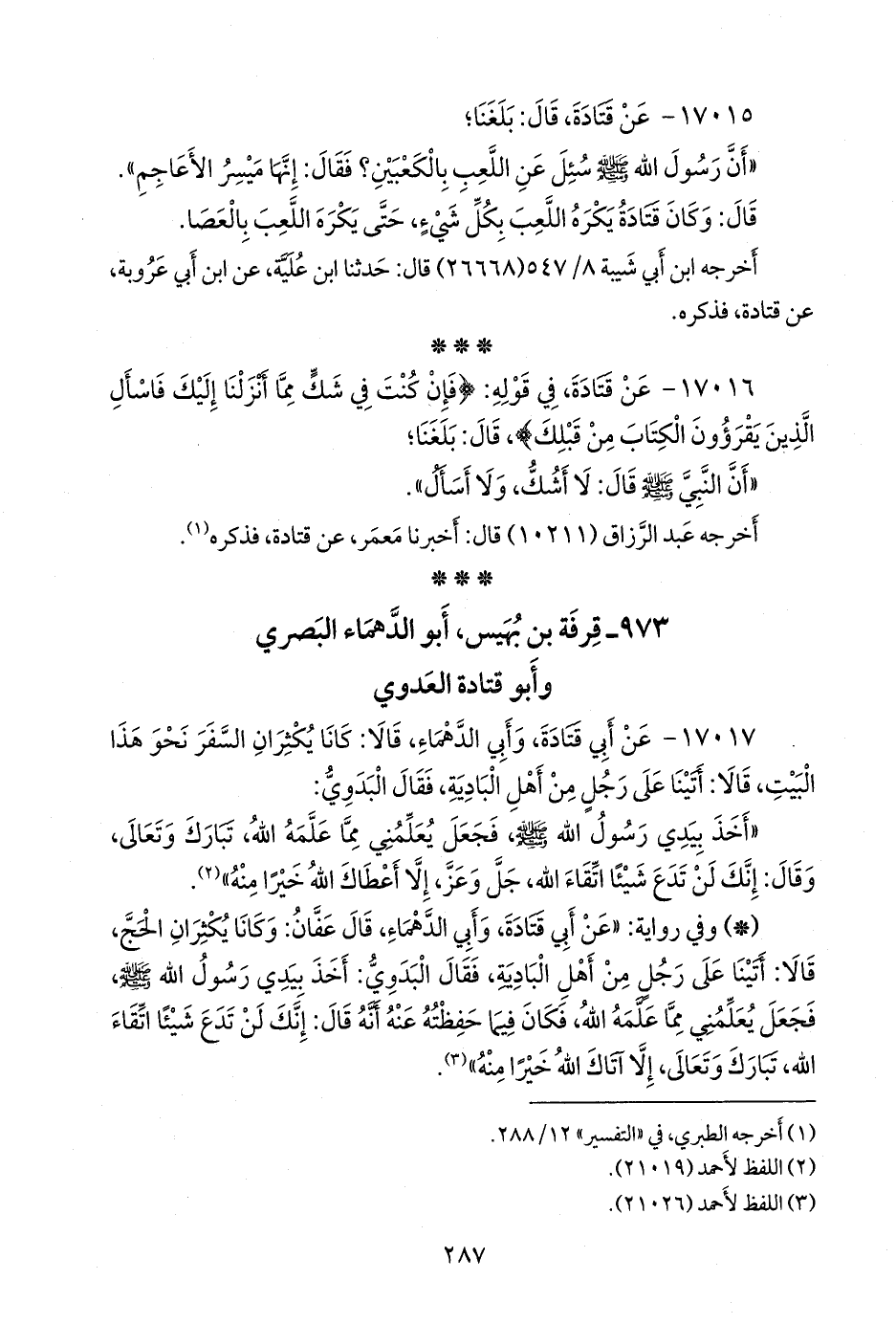 - وفي رواية: «عن أبي قتادة، وأبي الدهماء، قال عفان: وكانا يكثران الحج، قالا: أتينا على رجل من أهل البادية، فقال البدوي: أخذ بيدي رسول الله صَلى الله عَليه وسَلم فجعل يعلمني مما علمه الله، فكان فيما حفظته عنه أنه قال: إنك لن تدع شيئًا اتقاء الله، تبارك وتعالى، إلا آتاك الله خيرًا منه» (¬٢).