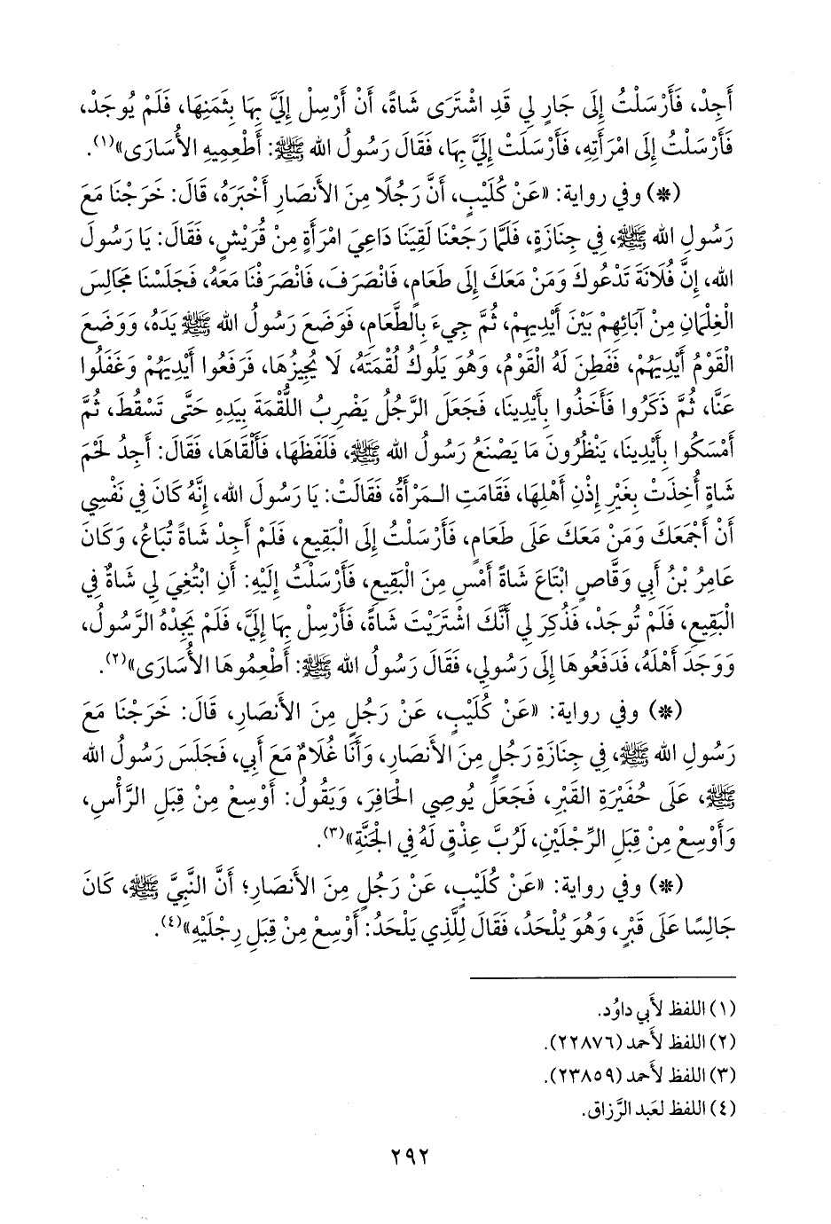 - وفي رواية: «عن كليب، عن رجل من الأنصار، قال: خرجنا مع رسول الله صَلى الله عَليه وسَلم في جِنازة رجل من الأنصار، وأنا غلام مع أبي، فجلس رسول الله صَلى الله عَليه وسَلم على حفيرة القبر، فجعل يوصي الحافر، ويقول: أوسع من قبل الراس، وأوسع من قبل الرجلين، لرب عذق له في الجنة» (¬٢).