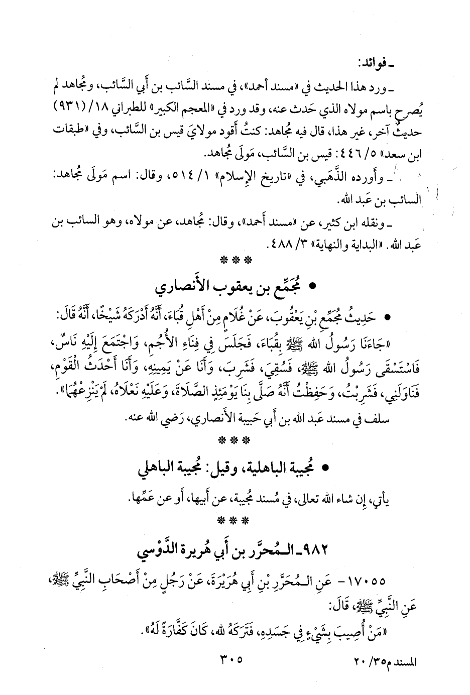 - ورد هذا الحديث في «مسند أحمد»، في مسند السائب بن أبي السائب، ومجاهد لم يصرح باسم مولاه الذي حدث عنه، وقد ورد في «المعجم الكبير» للطبراني ١٨/ (٩٣١) حديث آخر، غير هذا، قال فيه مجاهد: كنت أقود مولاي قيس بن السائب، وفي «طبقات ابن سعد» ٥/ ٤٤٦: قيس بن السائب مولى مجاهد.