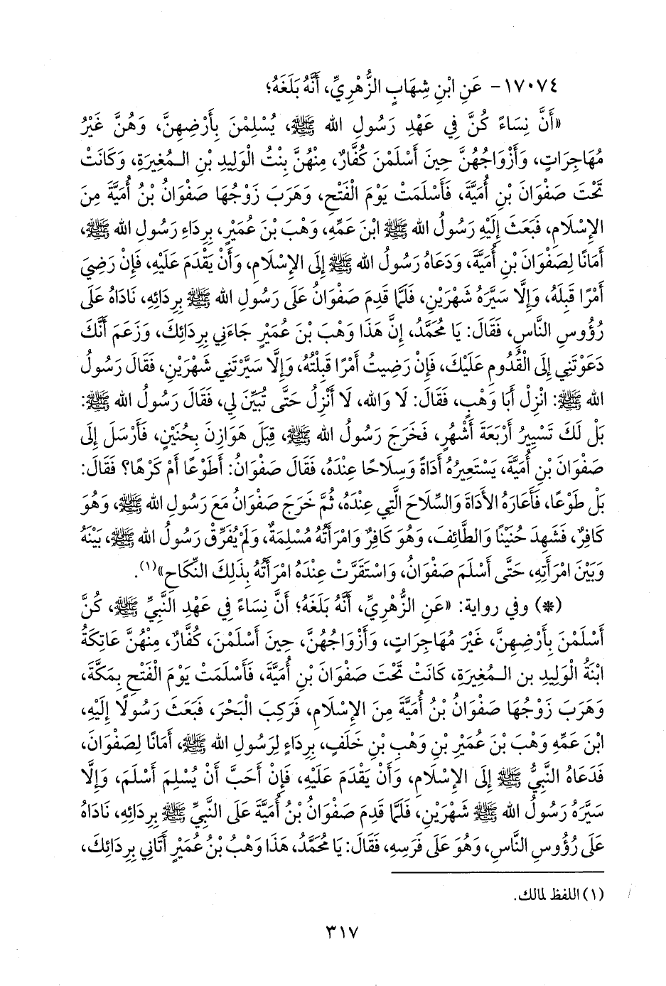 - وفي رواية: «عن الزُّهْري، أنه بلغه؛ أن نساء في عهد النبي صَلى الله عَليه وسَلم كن أسلمن بأرضهن، غير مهاجرات، وأزواجهن، حين أسلمن، كفار، منهن عاتكة ابنة الوليد بن المغيرة، كانت تحت صفوان بن أُمية، فأسلمت يوم الفتح بمكة، وهرب زوجها صفوان بن أُمية من الإسلام، فركب البحر، فبعث رسولا إليه، ابن عمه وهب بن عمير بن وهب بن خلف، برداء لرسول الله صَلى الله عَليه وسَلم أمانا لصفوان، فدعاه النبي صَلى الله عَليه وسَلم إلى الإسلام، وأن يقدم عليه، فإن أحب أن يسلم أسلم، وإلا سيره رسول الله صَلى الله عَليه وسَلم شهرين،