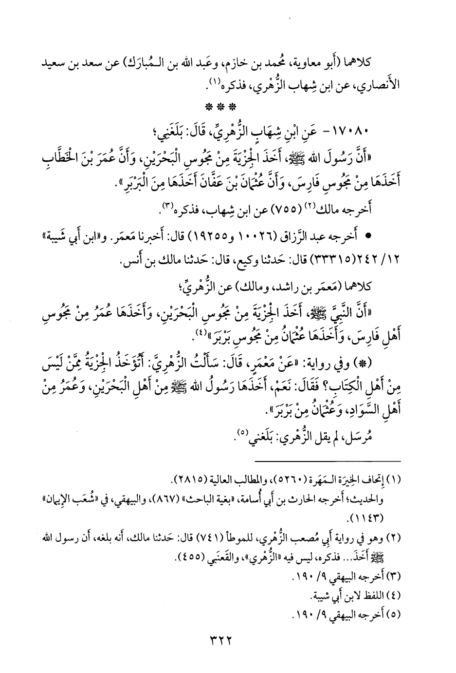 «أَن رسول الله صَلى الله عَليه وسَلم أَخذ الجزية من مجوس البحرين، وأَن عمر بن الخطاب أَخذها من مجوس فارس، وأَن عثمان بن عفان أَخذها من البربر».