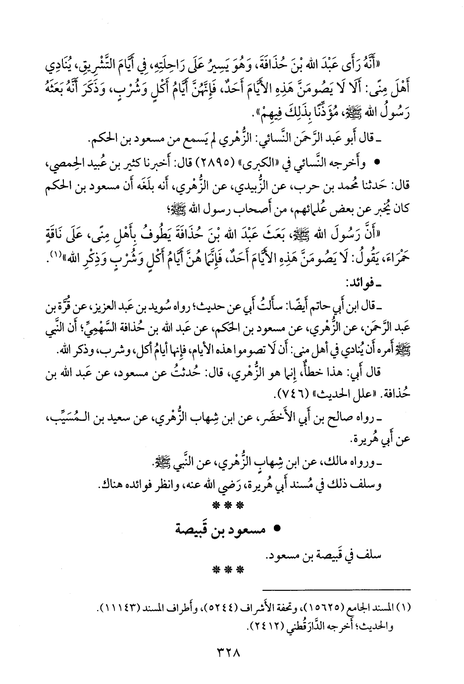 «أنه رأى عبد الله بن حذافة، وهو يسير على راحلته، في أيام التشريق، ينادي أهل منى: ألا لا يصومن هذه الأيام أحد، فإنهن أيام أكل وشرب، وذكر أنه بعثه رسول الله صَلى الله عَليه وسَلم مؤذنا بذلك فيهم».