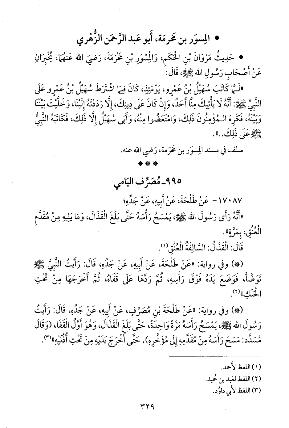 - وفي رواية: «عن طلحة بن مُصَرِّف، عن أبيه، عن جَدِّه، قال: رأيت رسول الله صَلى الله عَليه وسَلم يمسح رأسه مرة واحدة، حتى بلغ القذال، وهو أول القفا، (وقال مُسدد: مسح رأسه من مقدمه إلى مؤخره)، حتى أخرج يديه من تحت أذنيه» (¬٣).
