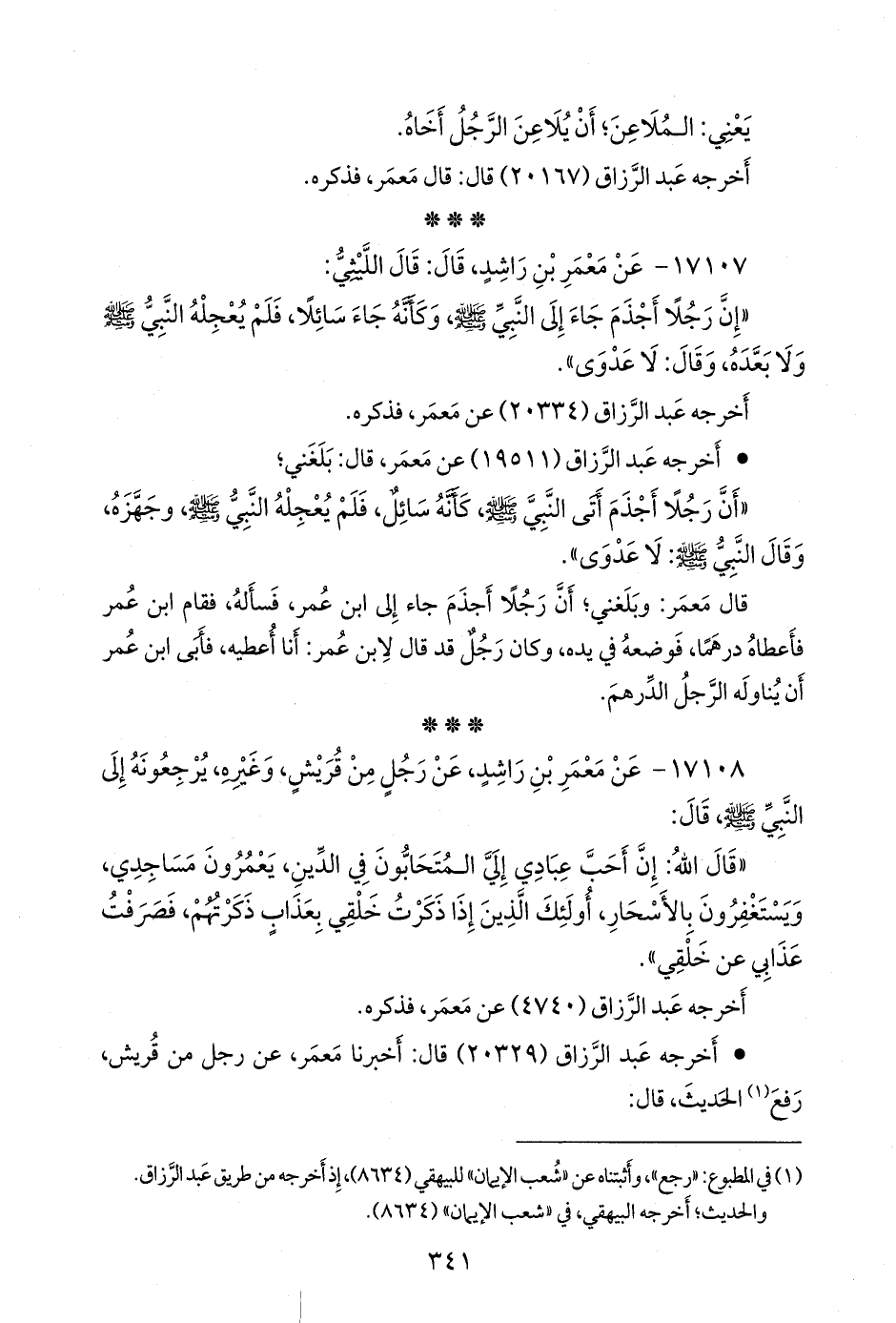 - لفظ (١٩٥١١): عن مَعمَر، قال: بلغني؛ أن رجلا أجذم أتى النبي صَلى الله عَليه وسَلم كأنه سائل، فلم يعجله النبي صَلى الله عَليه وسَلم وجهزه، وقال النبي صَلى الله عَليه وسَلم: لا عدوى».