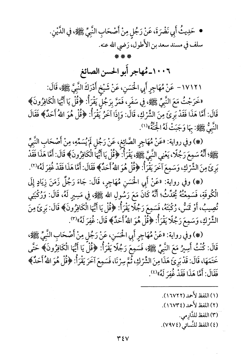 - وفي رواية: «عن مهاجر الصائغ، عن رجل لم يُسَمِّه، من أصحاب النبي صَلى الله عَليه وسَلم؛ أنه سمع رجلا، يعني النبي صَلى الله عَليه وسَلم يقرأ: {قُلْ يَا أَيُّهَا الْكَافِرُونَ} قال: أما هذا فقد برئ من الشرك، وسمع آخر يقرأ: {قُلْ هُوَ اللهُ أَحَدٌ} فقال: أما هذا فقد غفر له» (¬٢).