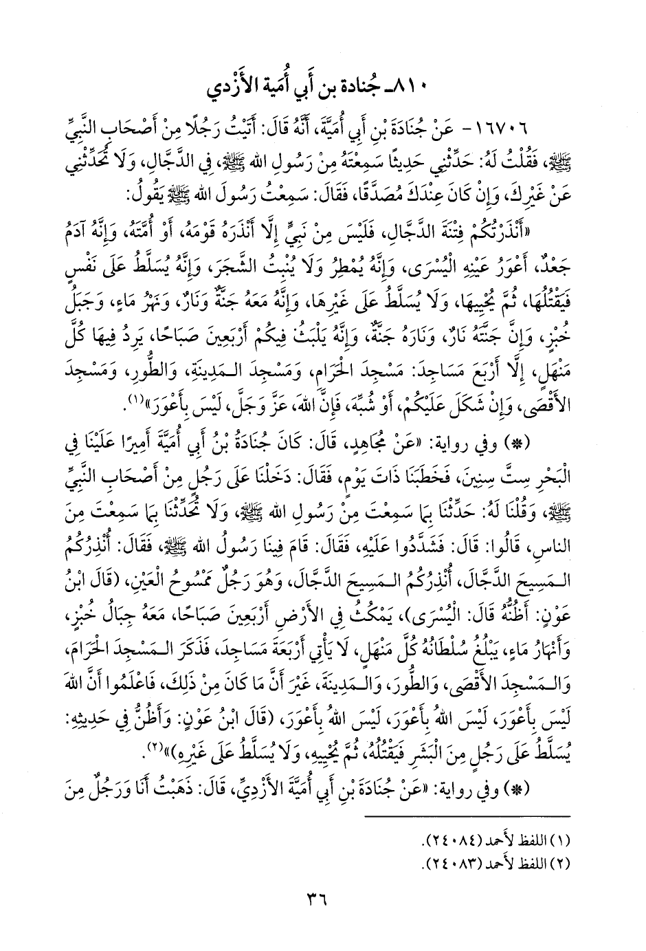 - وفي رواية: «عن مجاهد، قال: كان جُنادة بن أبي أُمية أميرا علينا في البحر ست سنين، فخطبنا ذات يوم، فقال: دخلنا على رجل من أصحاب النبي صَلى الله عَليه وسَلم وقلنا له: حدثنا بما سمعت من رسول الله صَلى الله عَليه وسَلم ولا تحدثنا بما سمعت من الناس، قالوا: قال: فشددوا عليه، فقال: قام فينا رسول الله صَلى الله عَليه وسَلم فقال: أنذركم المسيح الدجال، أنذركم المسيح الدجال، وهو رجل ممسوح العين، (قال ابن عَون: أظنه قال: اليسرى)، يمكث في الأرض أربعين صباحا، معه جبال خبز، وأنهار ماء، يبلغ سلطانه كل منهل، لا يأتي أربعة مساجد، فذكر المسجد الحرام، والمسجد الأقصى، والطور، والمدينة، غير أن ما كان من ذلك، فاعلموا أن الله ليس بأعور، ليس الله بأعور، ليس الله بأعور، (قال ابن عَون: وأظن في حديثه: يسلط على رجل من البشر فيقتله، ثم يحييه، ولا يسلط على غيره)» (¬٢).