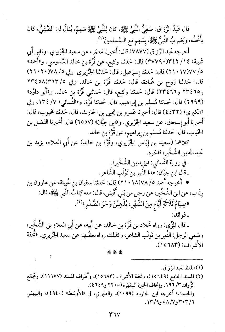 - قال المِزِّي: رواه خلاد بن قرة بن خالد، عن أبيه، عن أبي العلاء بن الشخير، وسمي الرجل: النمر بن تولب الشاعر، وكذلك رواه بعضهم عن سعيد الجُريري. «تحفة الأشراف» (١٥٦٨٣).
