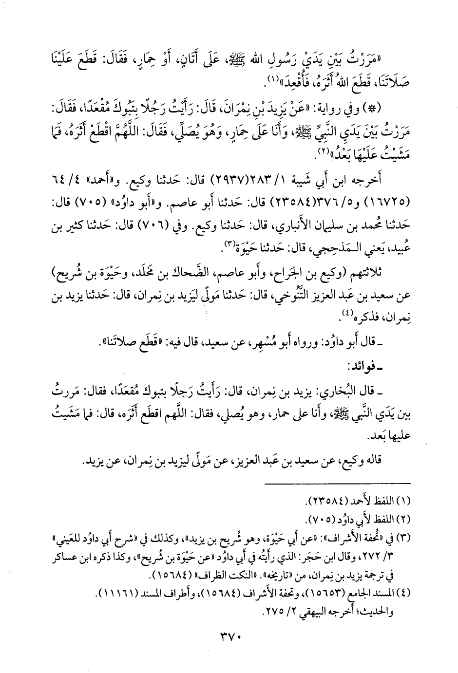 وقال لي أحمد بن أبي الأزهر: حدثنا مروان، قال: حدثنا سعيد، قال: حدثني مَولًى لابن نمران، عن يزيد بن نمران، قال: رأيت رجلا بتبوك، مقعدا، فسألته عن إقعاده، فقال: كان رسول الله صَلى الله عَليه وسَلم يصلي، فمررت بين يديه، وكنت على أتان، أو حمار، فقال: قطع صلاتنا، قطع الله أثره، يعني قال: فقعدت. «التاريخ الكبير» ٨/ ٣٦٥.