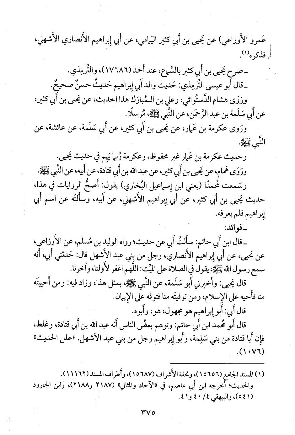 - قال عبد الرَّحمَن بن أبي حاتم الرازي: سألتُ أبي عن حديثٍ؛ رواه الوليد بن مسلم، عن الأوزاعي، عن يحيى، عن أبي إبراهيم الأَنصاري، رجل من بني عبد الأشهل قال: حدثني أبي، أنه سمع رسول الله صَلى الله عَليه وسَلم يقول في الصلاة على الميت: اللهم اغفر لأولنا، وآخرنا.