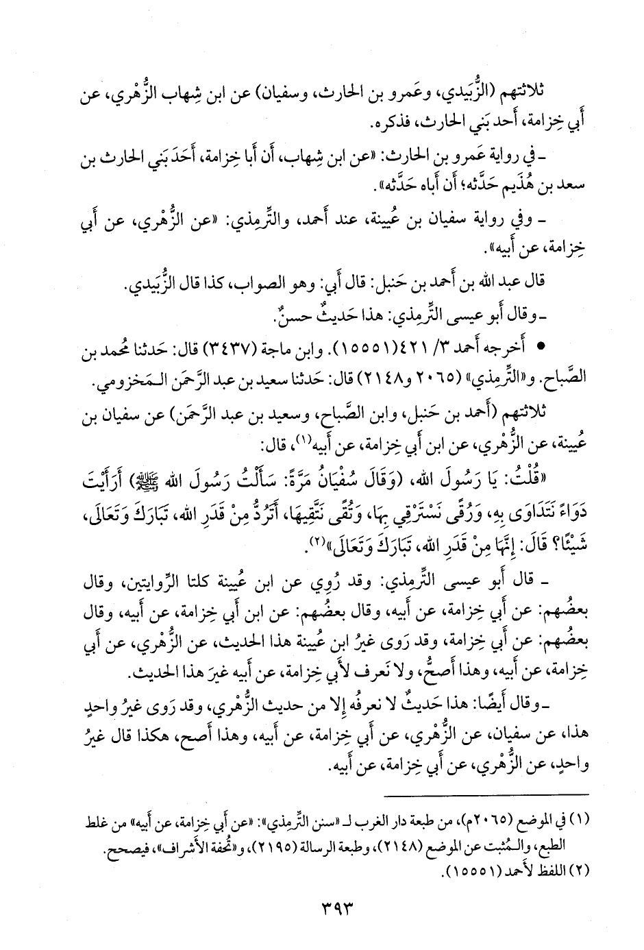 ثلاثتهم (أحمد بن حنبل، وابن الصباح، وسعيد بن عبد الرَّحمَن) عن سفيان بن عُيينة، عن الزُّهْري، عن ابن أبي خزامة، عن أبيه (¬١)، قال: