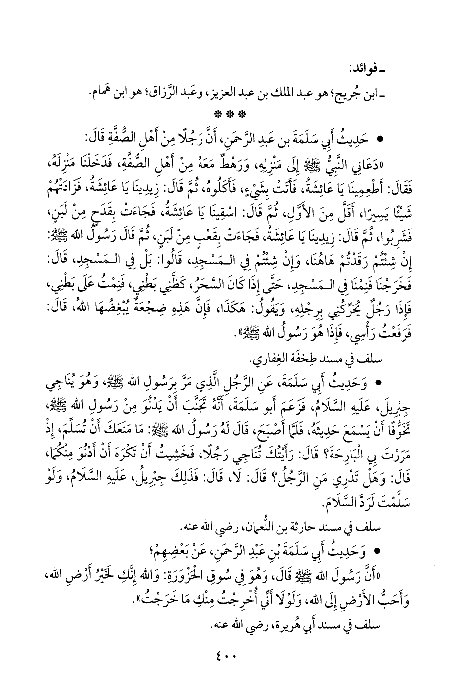 • وحديث أبي سلمة، عن الرجل الذي مر برسول الله صَلى الله عَليه وسَلم وهو يناجي جبريل، عليه السلام، فزعم أَبو سلمة، أنه تجنب أن يدنو من رسول الله صَلى الله عَليه وسَلم تخوفا أن يسمع حديثه، فلما أصبح، قال له رسول الله صَلى الله عَليه وسَلم: ما منعك أن تسلم، إذ مررت بي البارحة؟ قال: رأيتك تناجي رجلا، فخشيت أن تكره أن أدنو منكما، قال: وهل تدري من الرجل؟ قال: لا، قال: فذلك جبريل، عليه السلام، ولو سلمت لرد السلام.