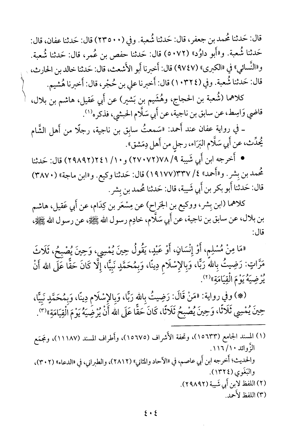 - وفي رواية: «من قال: رضيت بالله ربا، وبالإسلام دينا، وبمحمد نبيا، حين يمسي ثلاثا، وحين يصبح ثلاثا، كان حقا على الله أن يرضيه يوم القيامة» (¬٣).