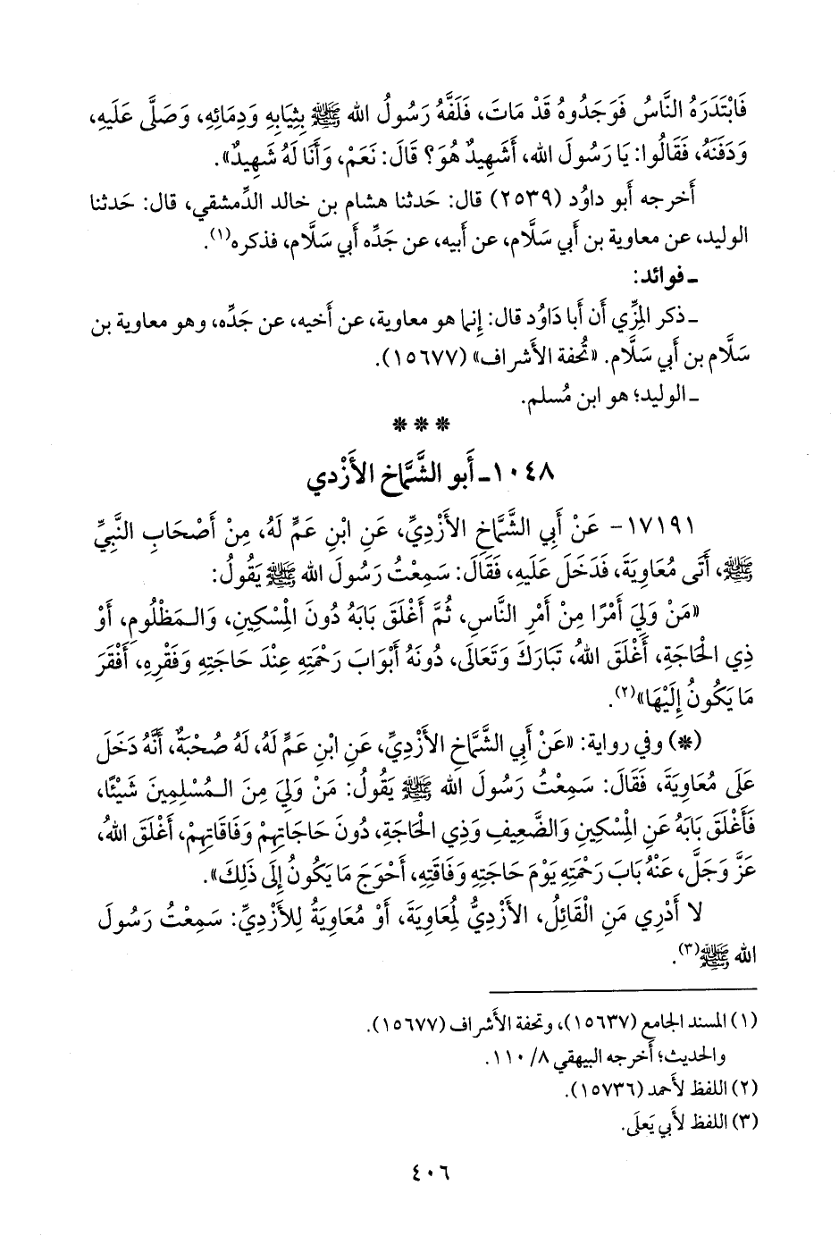 - وفي رواية: «عن أبي الشماخ الأزدي، عن ابن عم له، له صحبة، أنه دخل على معاوية، فقال: سمعت رسول الله صَلى الله عَليه وسَلم يقول: من ولي من المسلمين شيئا، فأغلق بابه عن المسكين والضعيف وذي الحاجة، دون حاجاتهم وفاقاتهم، أغلق الله، عز وجل، عنه باب رحمته يوم حاجته وفاقته، أحوج ما يكون إلى ذلك».